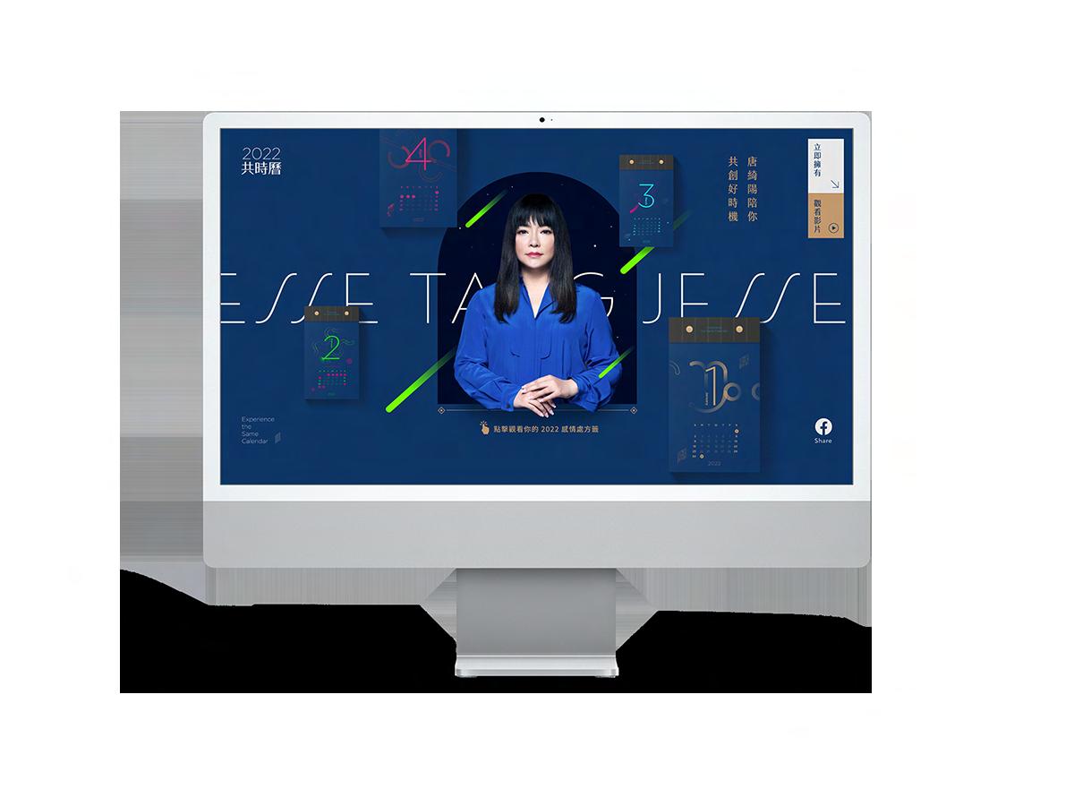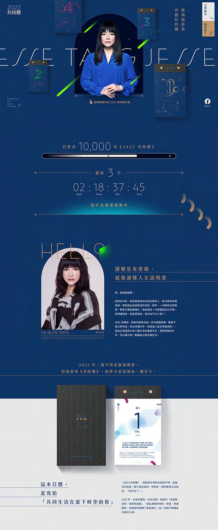 整體網頁風格延伸自共時曆的視覺系統,並加強了「日曆」這項載體在使用者體驗上的感受,此首頁刻意擺放了四 本日曆,漂浮著、圍繞在唐老師的身旁,呈現出一股「魔法」的氛圍。往下滑動也可以看見日曆撕下來後,一張ㄧ 張散落飛揚的狀態,幾屏柔軟的漂浮畫面,希望可以讓使用者在瀏覽的過程裡,透過螢幕也能聯想到撕下日曆的舒 服感受。