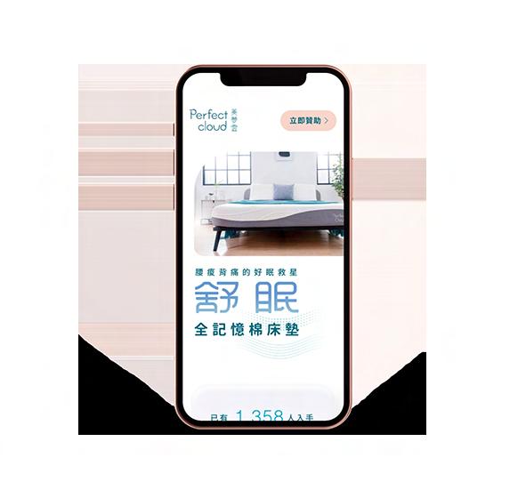 美夢雲希望解決現代人的睡眠困擾,研發出最具有支撐與彈性的美好床墊,整個網頁以白色作為基底,搭配若隱若 現的柔軟塊狀元素、以及留白跟漂浮感的編排,希望可以讓使用者在瀏覽的過程,感受到躺在床上的美好體驗。
