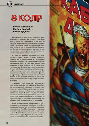 8 колір - Роман Тимчишин - Богдан Кордоба - Роман Грунт Студія перекладу «8 колір» заснована трьома фанатами коміксів, які бажають, аби український читач мав змогу читати те, що йому до вподоби, рідною українською мовою. Родзинка студії — це літературний та адаптований переклад коміксів. Ми читаємо комікс, усвідомлюємо його, а тоді перекладаємо для читача так, аби для нього ця історія стала близькою, якнайбільш зрозумілою та смішною. На цей час нашими орієнтирами є американські студії «Marvel» та «DC», однак ми впевнені, що це лише початок. Ми любимо комікси за те, що вони є неймовірним коктейлем, поєднанням усього в собі. Так, навіть якщо здавалося б, що в коміксах про Бетмена побутує драма, але й гумору насправді там доволі. Те саме є із Дедпулом: здавалося б, це просто схиблений персонаж, який виробляє, що бажає, однак насправді у його вчинках та фразах, до прикладу: «Це божевільно чи геніально? Ніколи не міг вловити різниці» подекуди набагато більше філософії, ніж у творах західних філософів. У команді студії зараз так і залишається троє фанів коміксів, які кайфують від роботи над перекладами і втіленням отриманого результату в життя. Щодо труднощів, то, напевно, єдиною такою проблемкою є отримання ліцензії від студії «Marvel». Ми уже просто засипали їх листами та зверненнями, однак відповіді поки що так і не отримали. Проте ми не втрачаємо віри та продовжуємо стукати у всеможливі двері, аби нас почули та помітили. Поки нашим єдиним проектом від студії є переклади серії коміксів про Дедпула та його напарника Кабеля, що неймовірно урізноманітнює сюжет. У майбутніх планах — переклад спецвипуску Дедпула, в якому він знищує увесь всесвіт «Marvel» без зволікань, та переклад коміксів Алана Мура «Хранителі», які для нас є одним із взірців коміксів у всіх їхніх аспектах.