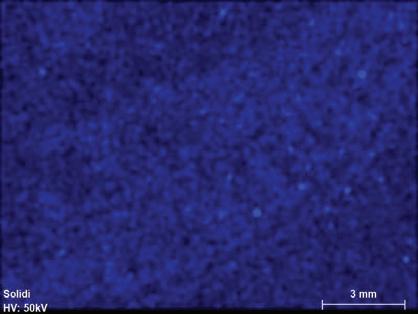 The embossing technique used to print the stamps produced a thin surface layer of ink on the envelope paper with little bleeding from the ink areas normally recorded by the elemental distribution maps of Figures 3-6. The elemental combinations reflect the color of the pigment used in the printing ink. X-ray emission counts collected over up to five times multiple areas of 4-6 mm2 can be used to evaluate the bulk compositions of surface ink, the penetration depth of the X-rays into the envelope paper, as well as the diluting effects of the cellulose filter paper and plastic foundation. The results of such an exercise are summarized in Table 2 for the four inked areas and the corresponding envelope paper. Here, the percentages of the inorganic components amount to 1-4%, while the remaining > 90% come from the organic paper and plastic components. Because the inorganic components were very low, amounting to less than 4% for the ink