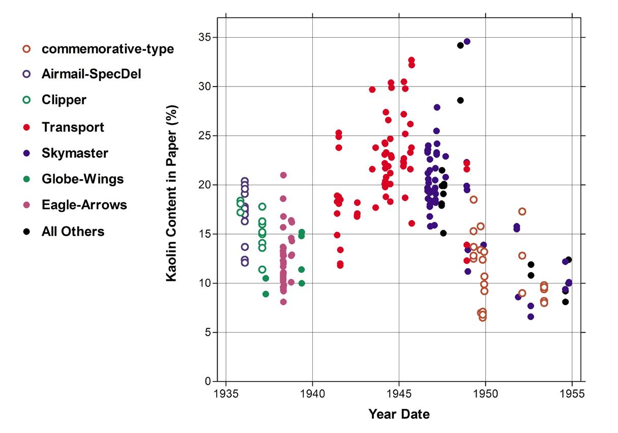 Figure 9. Summary of the kaolin content measured for the regular issue, commemorative, and airmail stamps within the 1935–1954 “first to press” time period.
