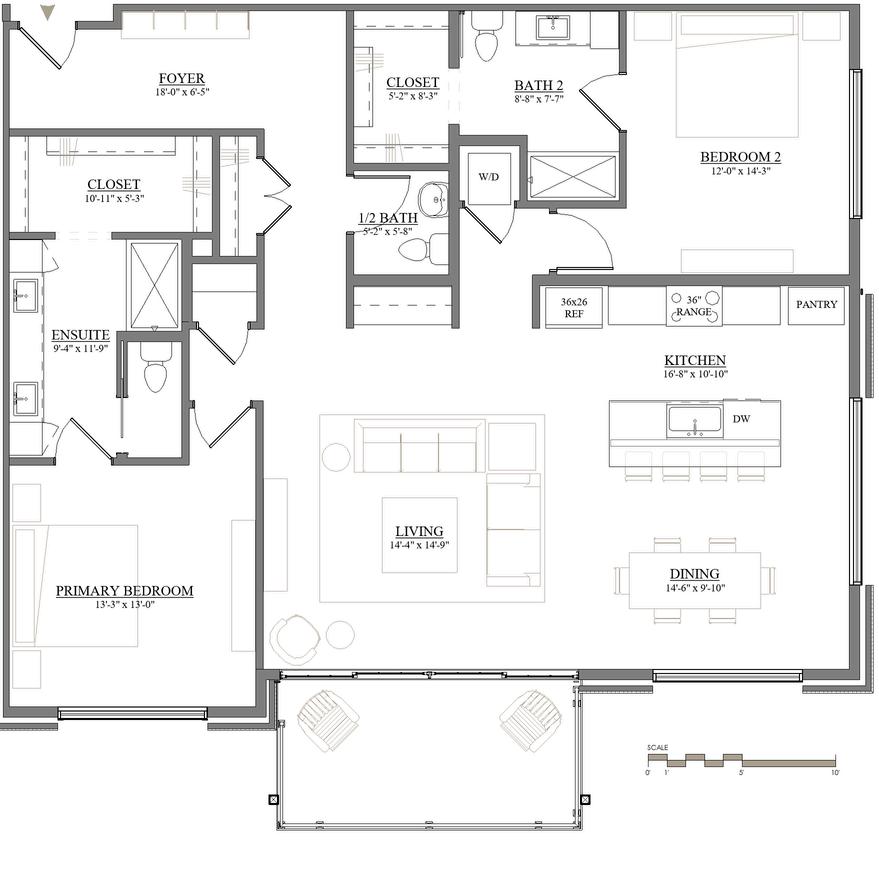 With many of the same features as Residence A, the layout of Residence B encourages a connected and functional living experience. Enjoy the dining area adjacent to the Chef’s kitchen while taking in the westfacing views provided by a 16' biparting Pella Door. Two spacious bedrooms are serviced by ensuite bathrooms, allowing for ultimate privacy from the main living space. Residence B thoroughly exemplifies the luxurious design that defines The Continental.