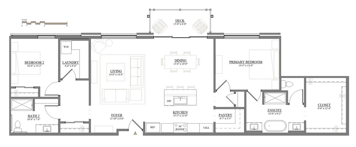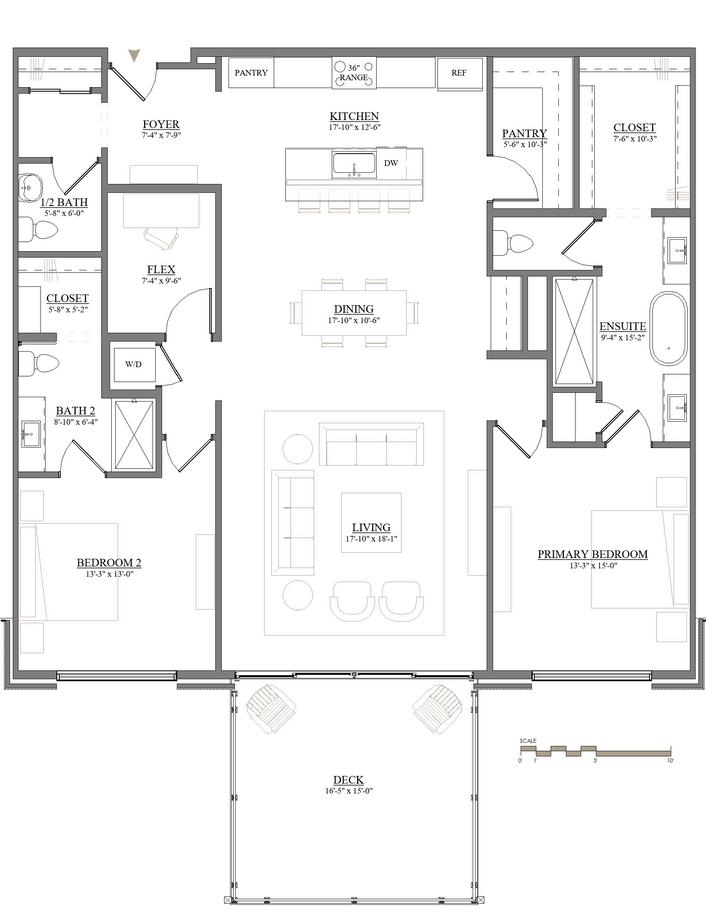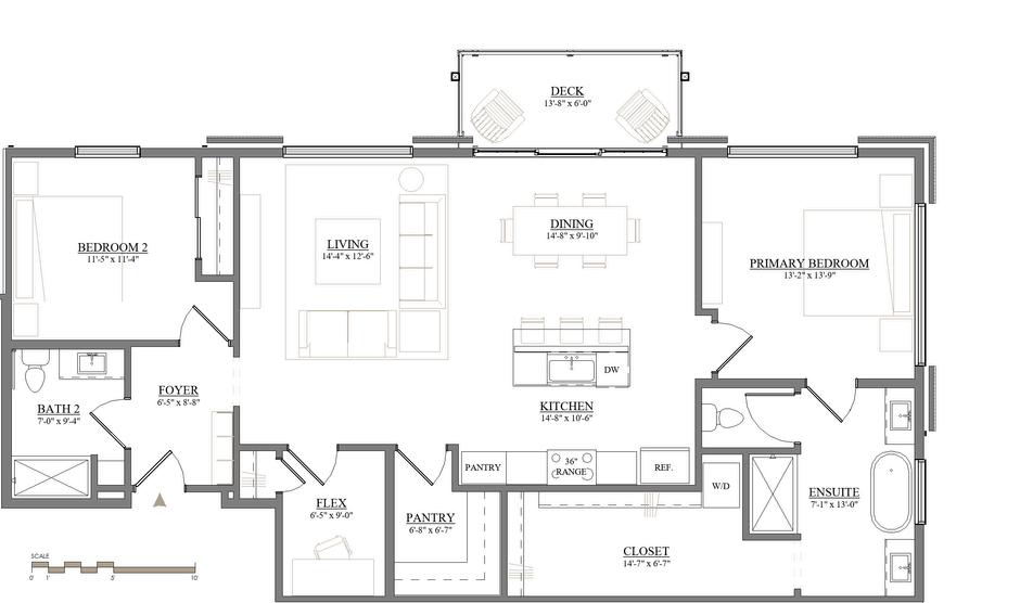 Residence D offers a valuable combination of luxury and function. The open living and dining spaces allow for a connected experience complimented by the adjacent eastern facing sliding door and deck. The Primary Bedroom features an incredible ensuite complete with a tiled shower, soaker tub and spacious walk-in closet.