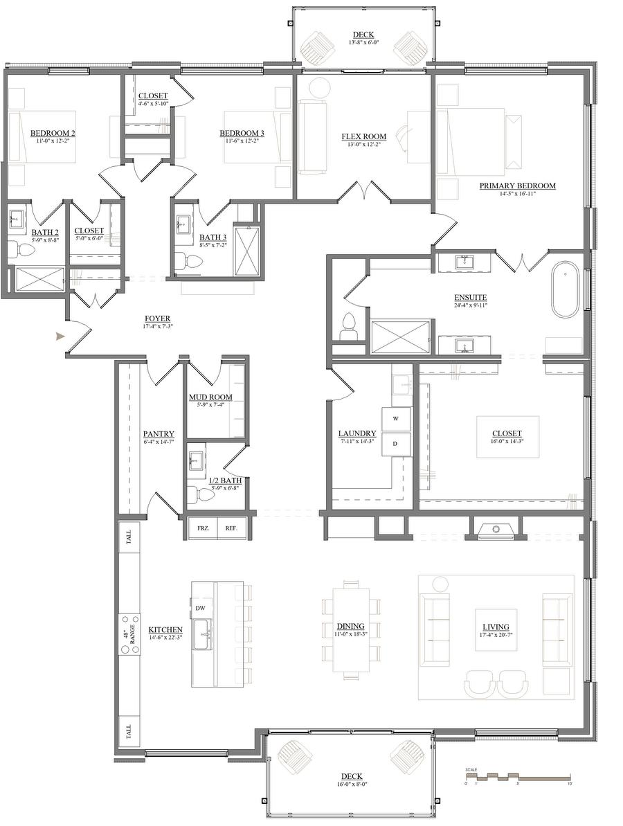 Upon entry into Residence A, eyes are immediately drawn to the expansive 16' bi-parting Pella Doors that flood the open floor plan with natural light. The layout allows the space to feel connected, yet defined. Residence A expertly combines functional spaces with statement features to provide a sought-after living experience.