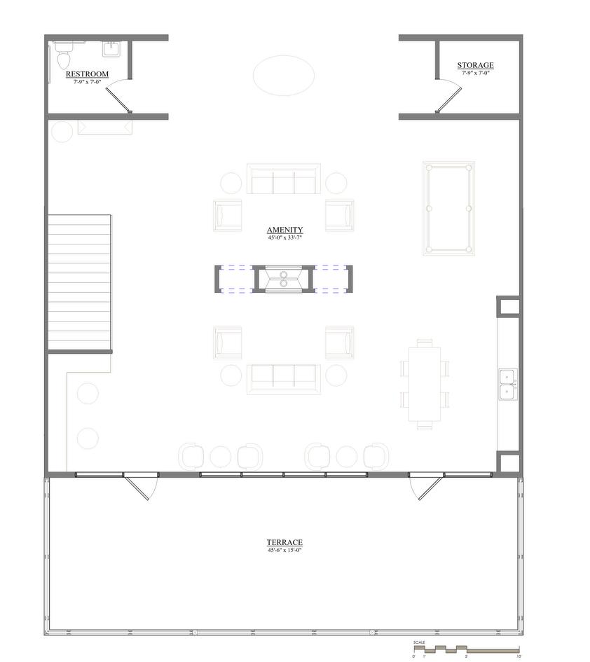 Just below the first floor amenity space, the integrated pool house seamlessly connects to the back patio and resort-style pool. An island, wet bar, two restrooms and a seating area provide homeowners with the infrastructure to entertain and impress their guests.