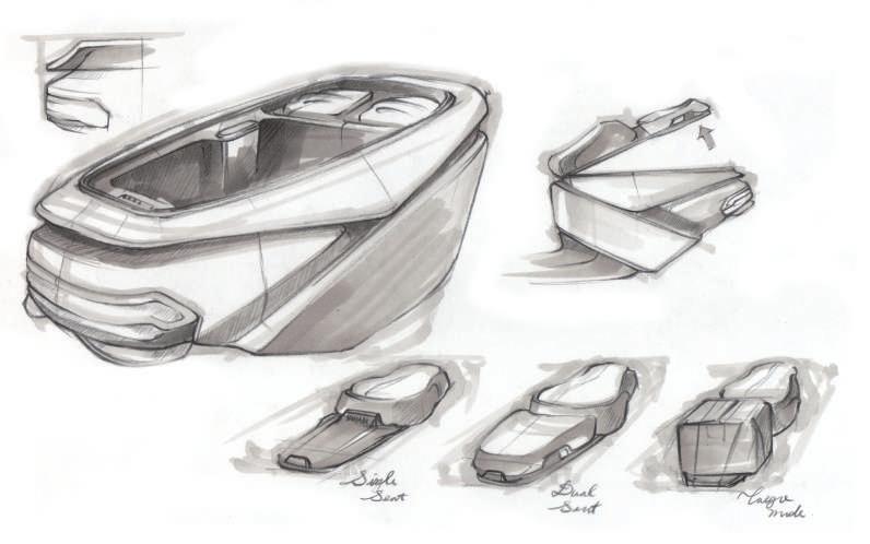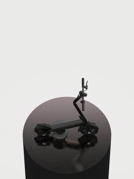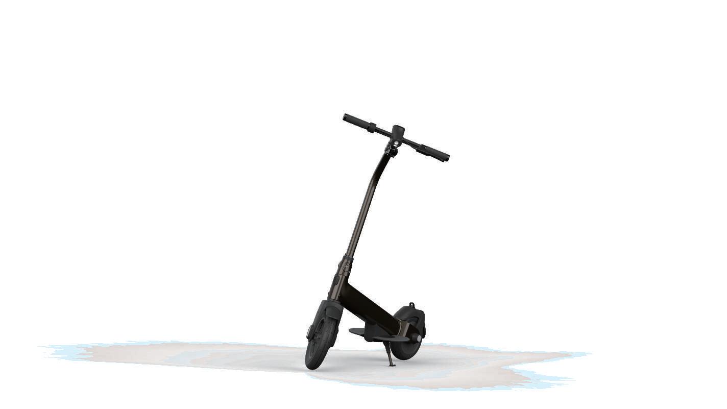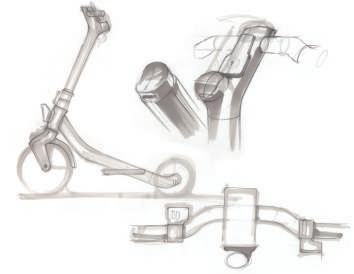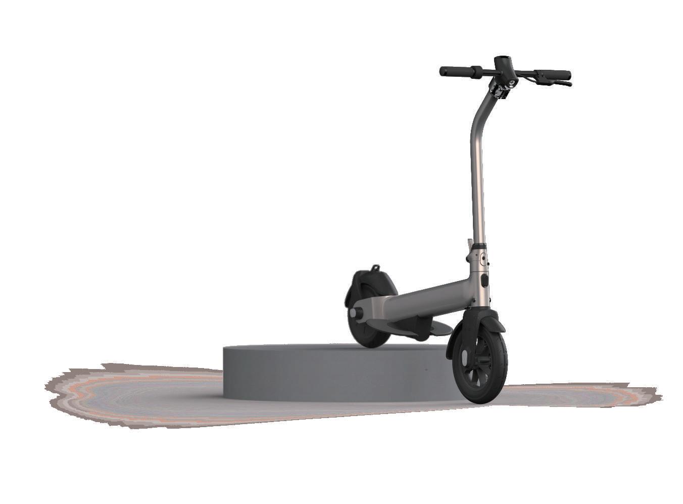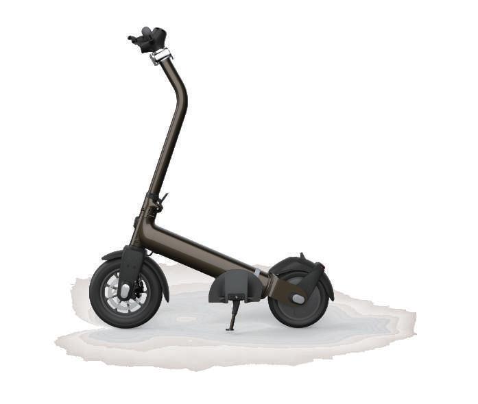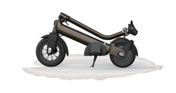 考量都市生活所需的方便性,除了電動滑板車本身具有的高機動性外,在收納功能上也是一大重點,本次 專案除了車身可以摺疊收納外,踏板上也設計成掀蓋的方式,讓使用者使用時有更大的踏板空間,收納後 也能大幅縮小滑板車佔用空間。