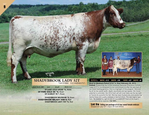 Bred to Waukaru Patent 8161*x. Due February 28, 2013. Polled. Presenting the 2008 Canadian National Champion Female. ‘Lady 52-T*x’ is a testament to our commitment to offer the very best of our breed leading genetics. She is a highlight of this program. Admired by all for her overall width, depth, soundness and eye appeal. Her future potential is unlimited. Her 2012 bull calf will most likely see the tan bark at Toronto & Louisville this fall. She has been flushed only once producing twenty-three (23) quality embryos in April of 2012. The sale begins right here. We reserve the right to one (1) successful ET flush at the buyer’s convenience & our expense. CSA 100%