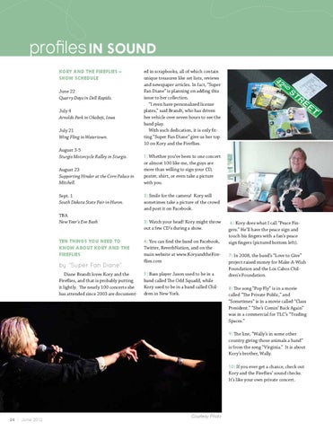 ed in scrapbooks, all of which contain unique treasures like set lists, reviews and newspaper articles. In fact, “Super Fan Diane” is planning on adding this issue to her collection. “I even have personalized license plates,” said Brandt, who has driven her vehicle over seven hours to see the band play. With such dedication, it is only fitting “Super Fan Diane” give us her top 10 on Kory and the Fireflies. 1) Whether you’ve been to one concert or almost 100 like me, the guys are more than willing to sign your CD, poster, shirt, or even take a picture with you. 2) Smile for the camera! Kory will sometimes take a picture of the crowd and post it on Facebook. 3) Watch your head! Kory might throw out a few CD’s during a show.