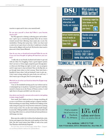 muscles to repair and it’s also a nice mental break! Do you give yourself a cheat day? What is your favorite cheat meal? Yes! My approach to dieting is allowing grace and moderation. I grew up in a food-loving family where all our events rotated around food. Allowing cheat meals also re-sets the metabolism. During show prep time, I allow one cheat meal a week, but as it gets closer to the show I really have to buckle down and be diligent with my food. My favorite cheat meal is pizza and a Dairy Queen Blizzard. How do you stay so disciplined/motivated? What do you do if you ever have thoughts of getting off track from your routine? I really rely on my friends, husband and trainer to get real with me when I’m struggling. I have a good support system that I can turn to. Every single competitor goes through phases where you feel things are right on track - you see progress and it’s super easy to stay motivated. Then on the flip side, we go through times where we feel crummy. There have been a handful of times when I tell my husband I want to give up... I don’t want to keep eating the same foods over and over, I don’t want to go to the gym. But I’ve never given up What did you do when you found out about the Oxygen magazine feature? I was on the treadmill warming up for my workout and an e-mail popped up on my phone. I opened it up and it said they wanted to feature me in the Future of Fitness section. I cried right there in the gym and didn’t care who saw me. Any advice you have for someone who wants to start getting in better shape/health? Start small. Don’t think you have to change everything all at once or you’ll burn out quickly and get a negative mindset. Find something you enjoy doing, whether it be walking on the trails, doing hot yoga (one of my favorite workouts!) or joining a boot camp or class. You can also start making small changes to your diet. Making healthier substitutions little by little will have huge effects later on, and your body and taste preferences will change over time Blom says she couldn’t do it without her husband who cooks for her and supports her (they also work together at New York Life). She also noted trainer Amy Miller as well as her coach Tara Thatcher with Perfectly Prepared. For more info, visit her Facebook page: Amber Blom - Competitor and Fitness Model or follower her @AmberBlom1.