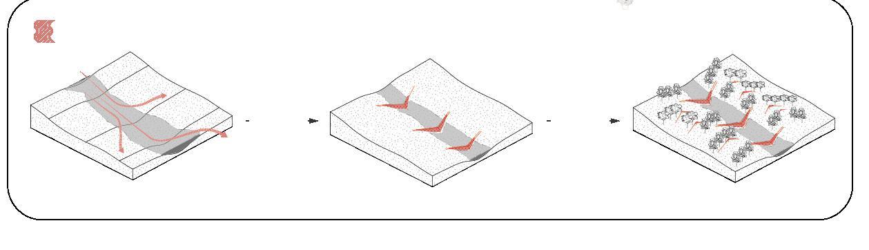 A large area will be divided into multiple slice units to be designed separately. Each unit framework consists of three main phases. In the first phase, earth is deposited to lay pipes and armor structures to establish a topographic base. The second phase allows vegetation to establish, actively gathering moisture and purifying runoftin separated channels. The third phase is landscaped infrastructure and potential embedded exclusive residences.