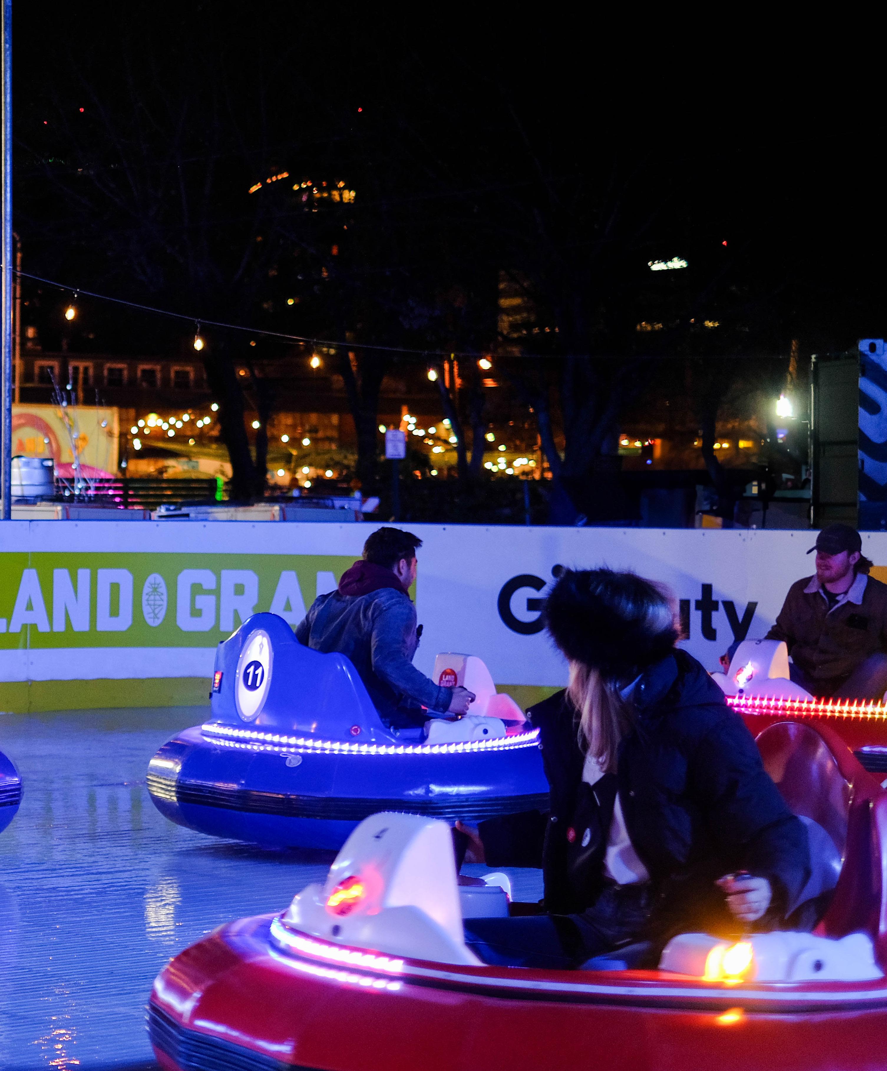 Ice Bumper cars in action at Land-Grant Brewing Co.’s Wintergarden, which is complete with igloos, keg curling and will return for 2024-2025. Photo courtesy of Land-Grant Brewing Co.