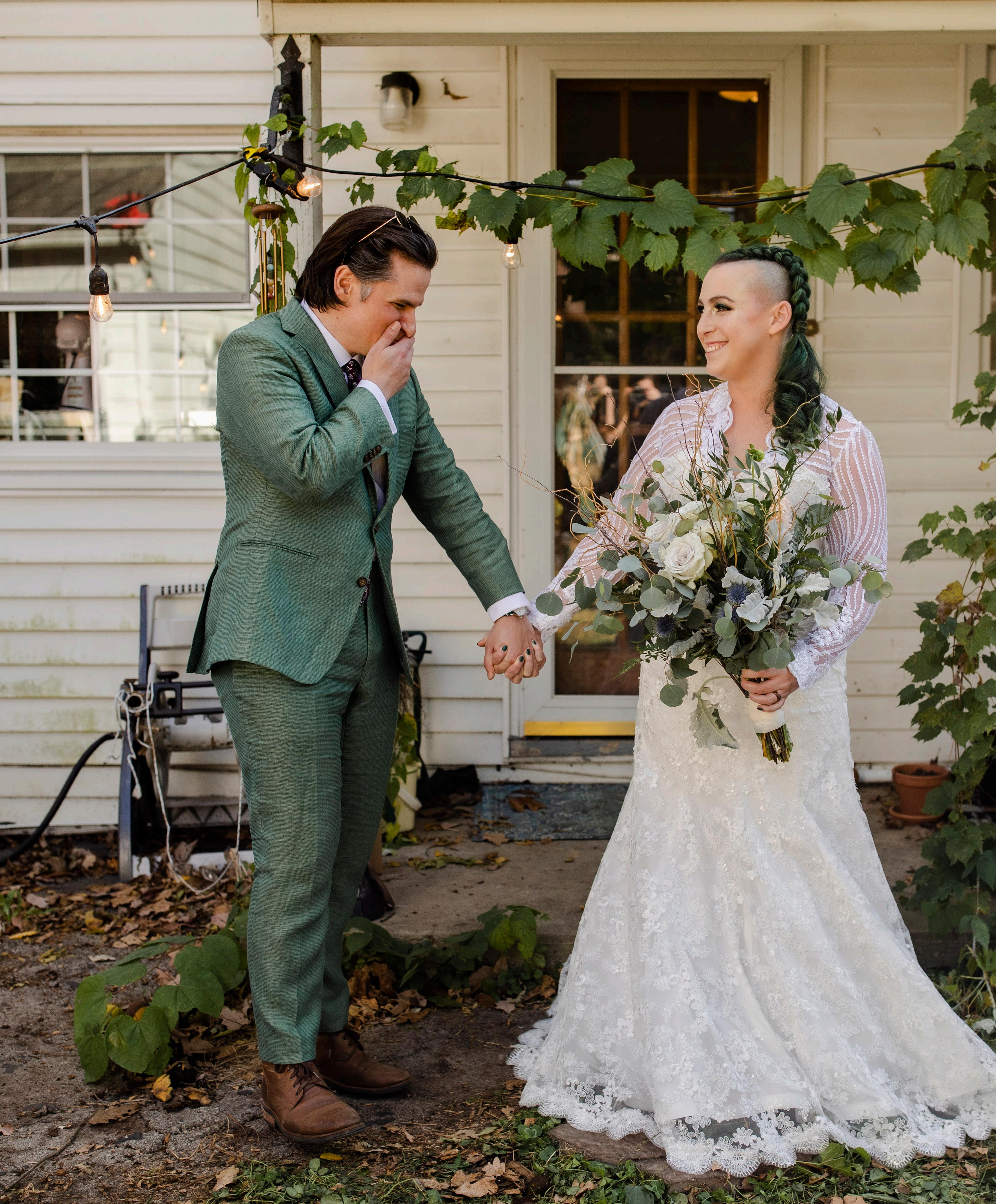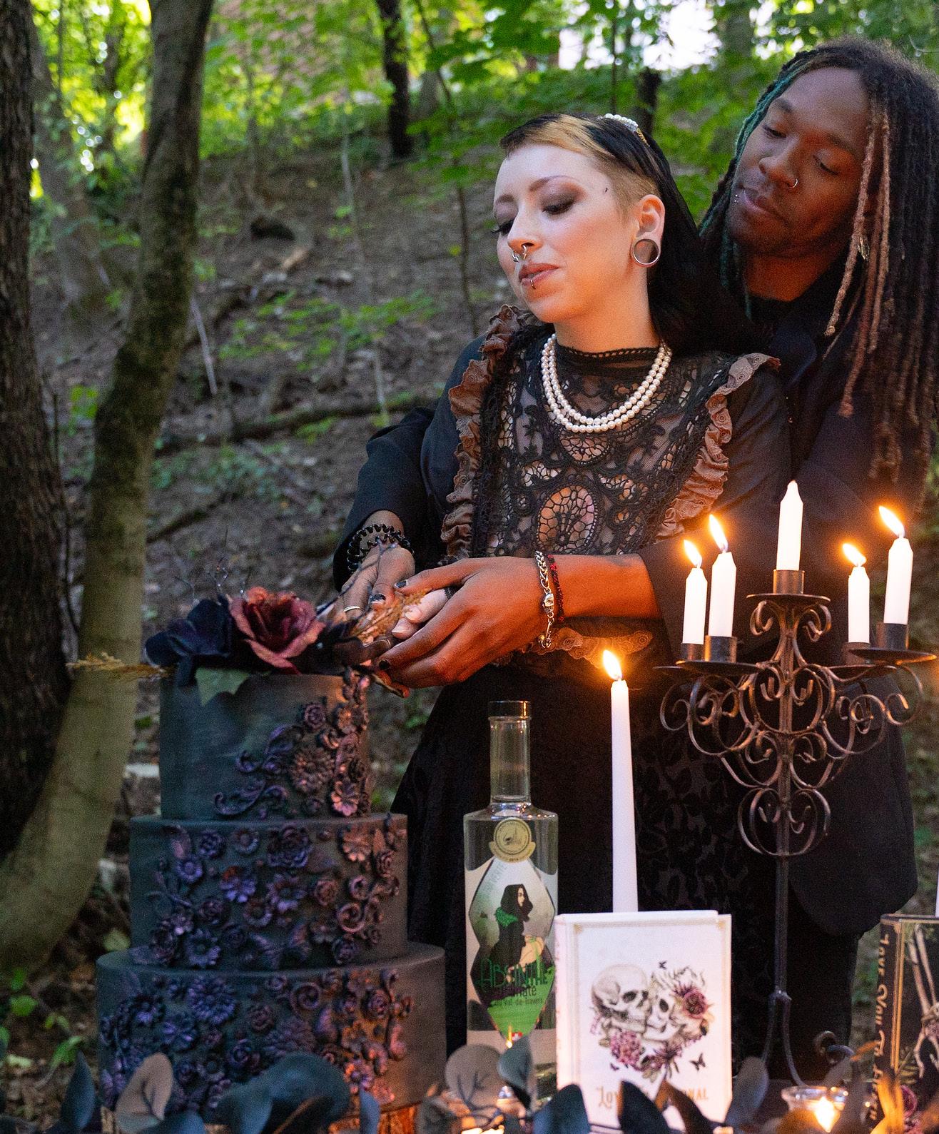 Celebrating the couple’s love of the natural world, a tree-planting and handfasting took place in the gazebo of the Franklin Park Conservatory’s Palm House. The party participated by adding soil to their tree’s pot and watering it. The wedding itself was a celebration not only of their relationship, but of the renewal and healing that comes from fostering a community enmeshed in the natural world.