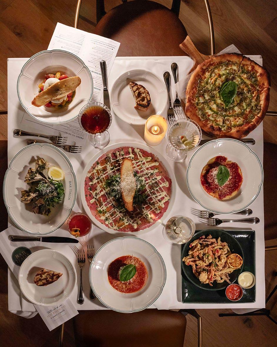 ← A variety of Bar Italia’s dinner offerings, such as wood-fired pizza, hand-made pasta, and beef carpaccio