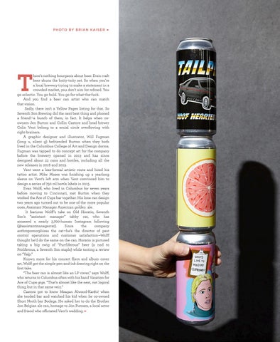 here’s nothing bourgeois about beer. Even craft beer shuns the hoity-toity set. So when you’re a local brewery trying to make a statement in a crowded market, you don’t aim for refined. You go eclectic. You go bold. You go for what-the-fuck. And you find a beer can artist who can match that vision. Sadly, there isn’t a Yellow Pages listing for that. So Seventh Son Brewing did the next best thing and phoned a friend—a bunch of them, in fact. It helps when coowners Jen Burton and Collin Castore and head brewer Colin Vent belong to a social circle overflowing with right-brainers. A graphic designer and illustrator, Will Fugman (long u, silent g) befriended Burton when they both lived in the Columbus College of Art and Design dorms. Fugman was tapped to do concept art for the company before the brewery opened in 2013 and has since designed about 22 cans and bottles, including all the new releases in 2018 and 2019. Vent went a less-formal artistic route and hired his tattoo artist. Mike Moses was finishing up a yearlong sleeve on Vent’s left arm when Vent convinced him to design a series of 750 ml bottle labels in 2015. Evan Wolff, who lived in Columbus for seven years before moving to Cincinnati, met Burton when they worked the Ace of Cups bar together. His lone can design two years ago turned out to be one of the more popular ones, Assistant Manager American golden ale. It features Wolff’s take on Old Horatio, Seventh Son’s “assistant manager” tabby cat, who has amassed a nearly 3,700-human Instagram following (@assistantmanagercat). Since the company anthropomorphizes the cat—he’s the director of pest control operations and customer satisfaction—Wolff thought he’d do the same on the can. Horatio is pictured taking a big swig of “Purrliferous” beer (a nod to Proliferous, a Seventh Son staple) while texting a review on “Yalp.” Known more for his concert fliers and album cover art, Wolff got the simple pen-and-ink drawing right on the first take. “The beer can is almost like an LP cover,” says Wolff, who returns to Columbus often with his band Vacation for Ace of Cups gigs. “That’s almost like the next, not logical thing, but in that same vein.” Castore got to know Meagan Alwood-Karĉić when she tended bar and watched his kid when he co-owned Short North bar Bodega. He asked her to do the Brother Jon Belgian ale can, homage to Jon Putnam, a local actor and friend who officiated Vent’s wedding. •