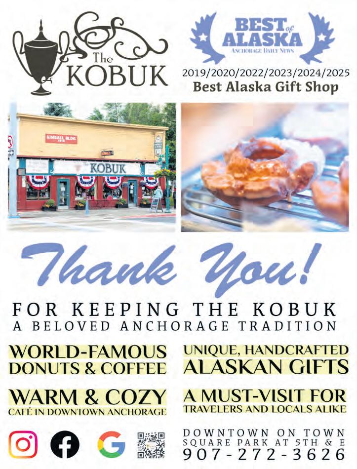 The Kobuk, nestled in the heart of downtown Anchorage, has been a beloved local treasure for over a century. Since 1915, we’ve proudly served generations of Alaskans and visitors alike, offering a unique blend of history, charm and exceptional customer care. Known for our world-famous donuts, handcrafted teas and an eclectic selection of Alaskan-made gifts and knickknacks, The Kobuk is more than just a store - it’s an experience. Whether you’re grabbing a cozy cup of coffee or discovering a one-of-a-kind keepsake, we invite you to step inside and be part of our long-standing tradition.