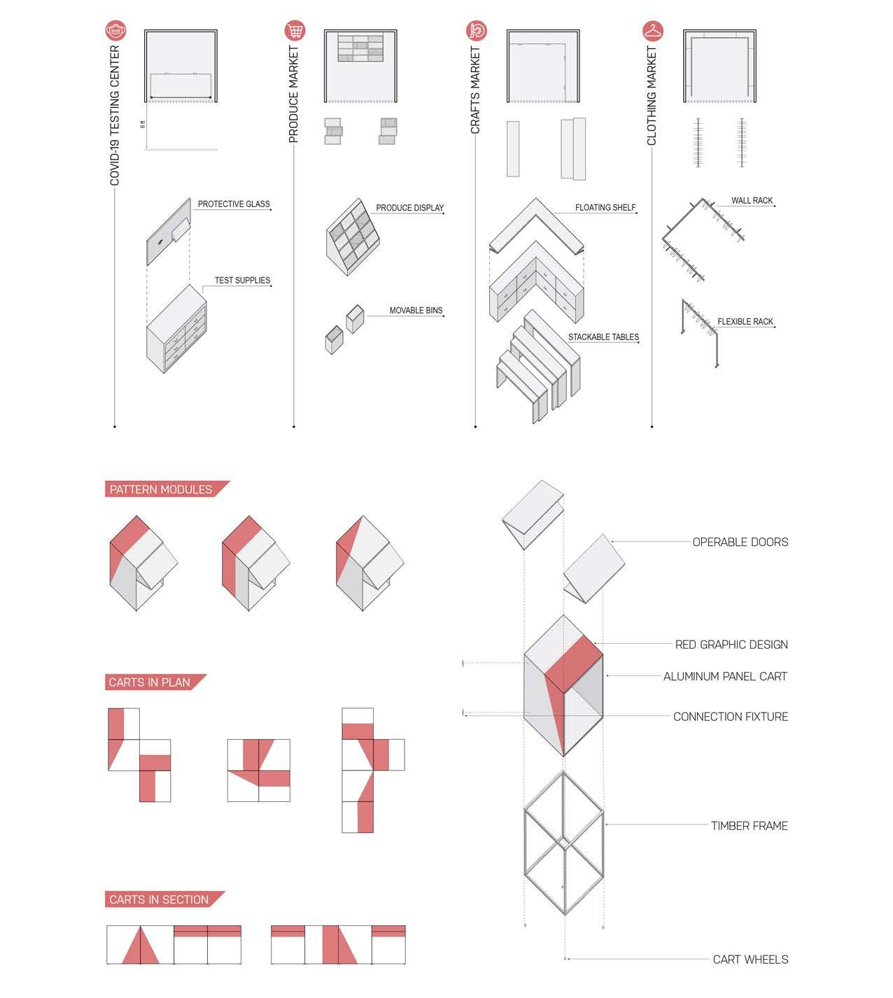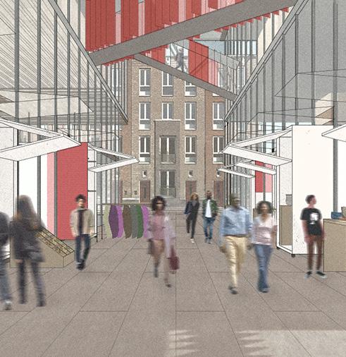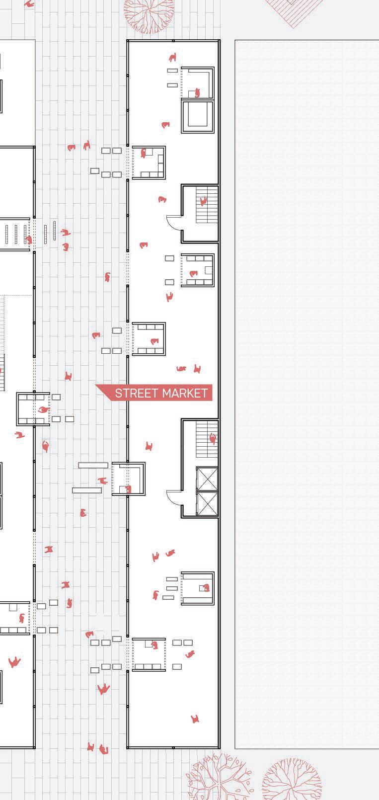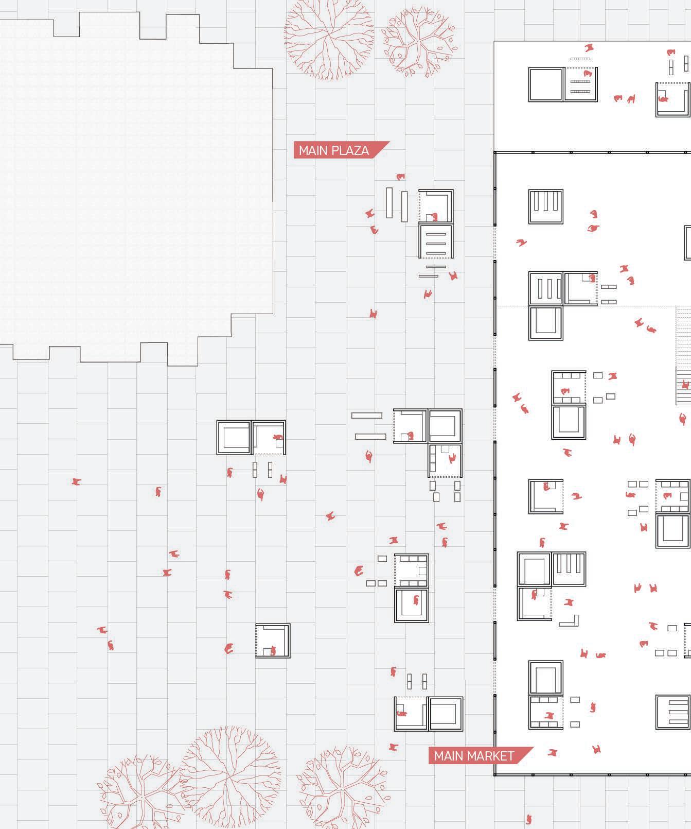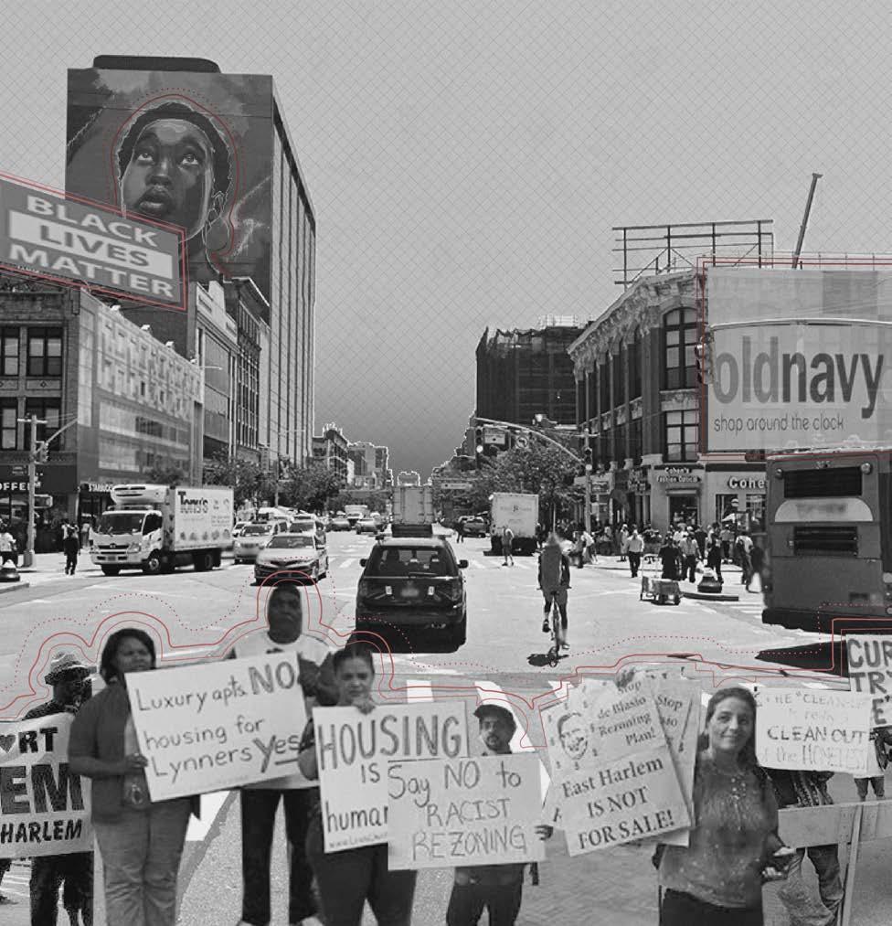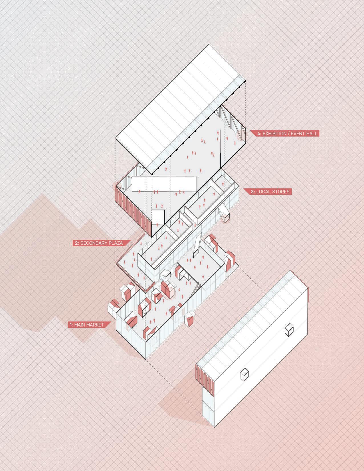 This project is located along the intersection of Adam Clayton Powell Boulevard and 125th street, which was the site of many historic activism movements. The recent contentious rezoning of 125th street positioned our intervention at a crucial setting amid the current gentrification in Harlem. This redevelopment displaced over seventy local businesses and many street vendors who did not own any property. Our project aims to allow these local vendors and businesses to reclaim their place in Harlem by formalizing a market and including storefronts for small businesses to own. The massing strategy uses a large cantilever to engage the adjacent plaza, and carves a void within the building to connect the largely developed 125th street with the quieter 126th street. Our design also employs modular market carts and an operable facade to create adaptable market experiences. Additionally, the exhibition and event space on the top floor would educate the public about activism movements in Harlem. The red louvers throughout the building are a distinct graphic element and control direct light.