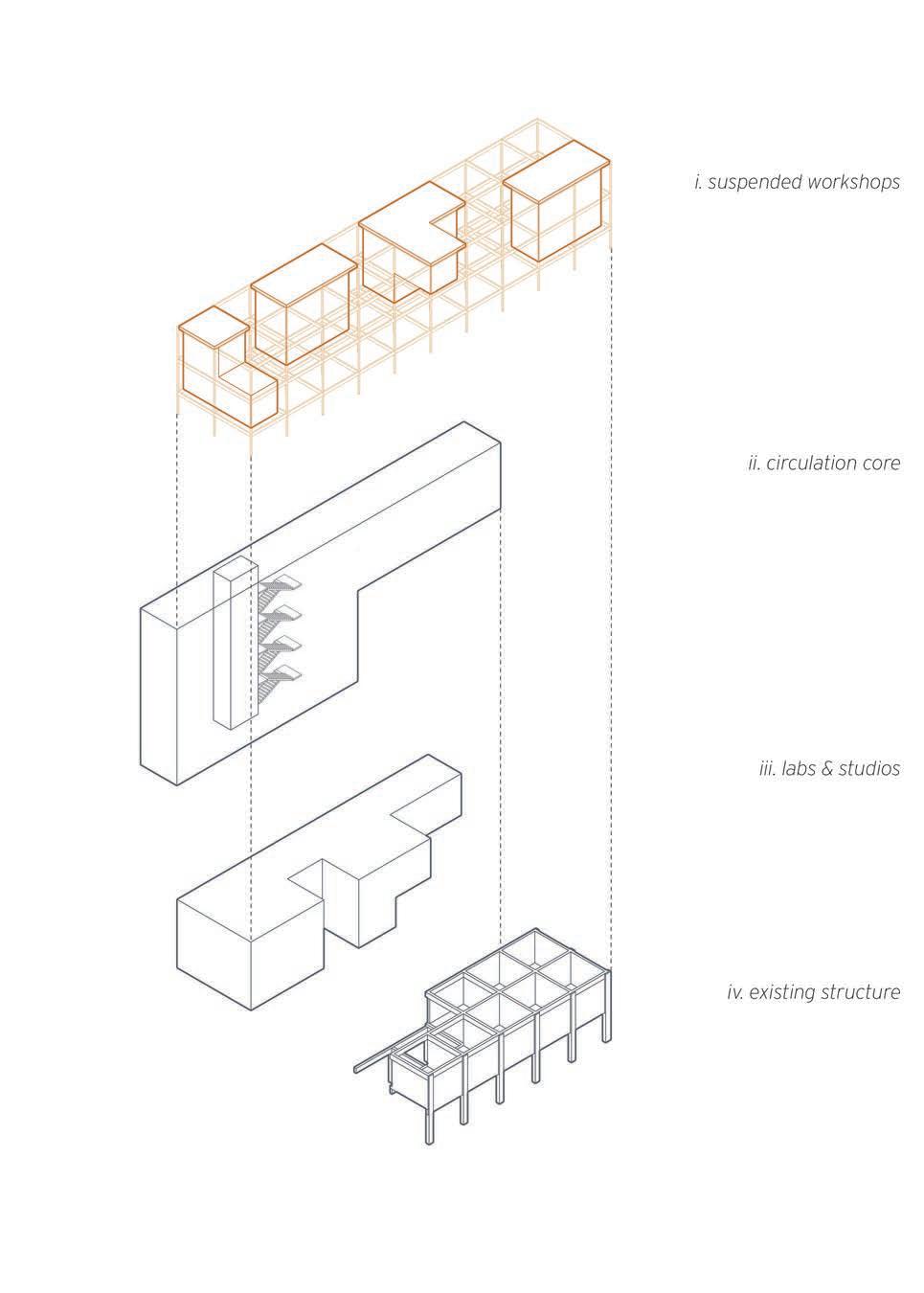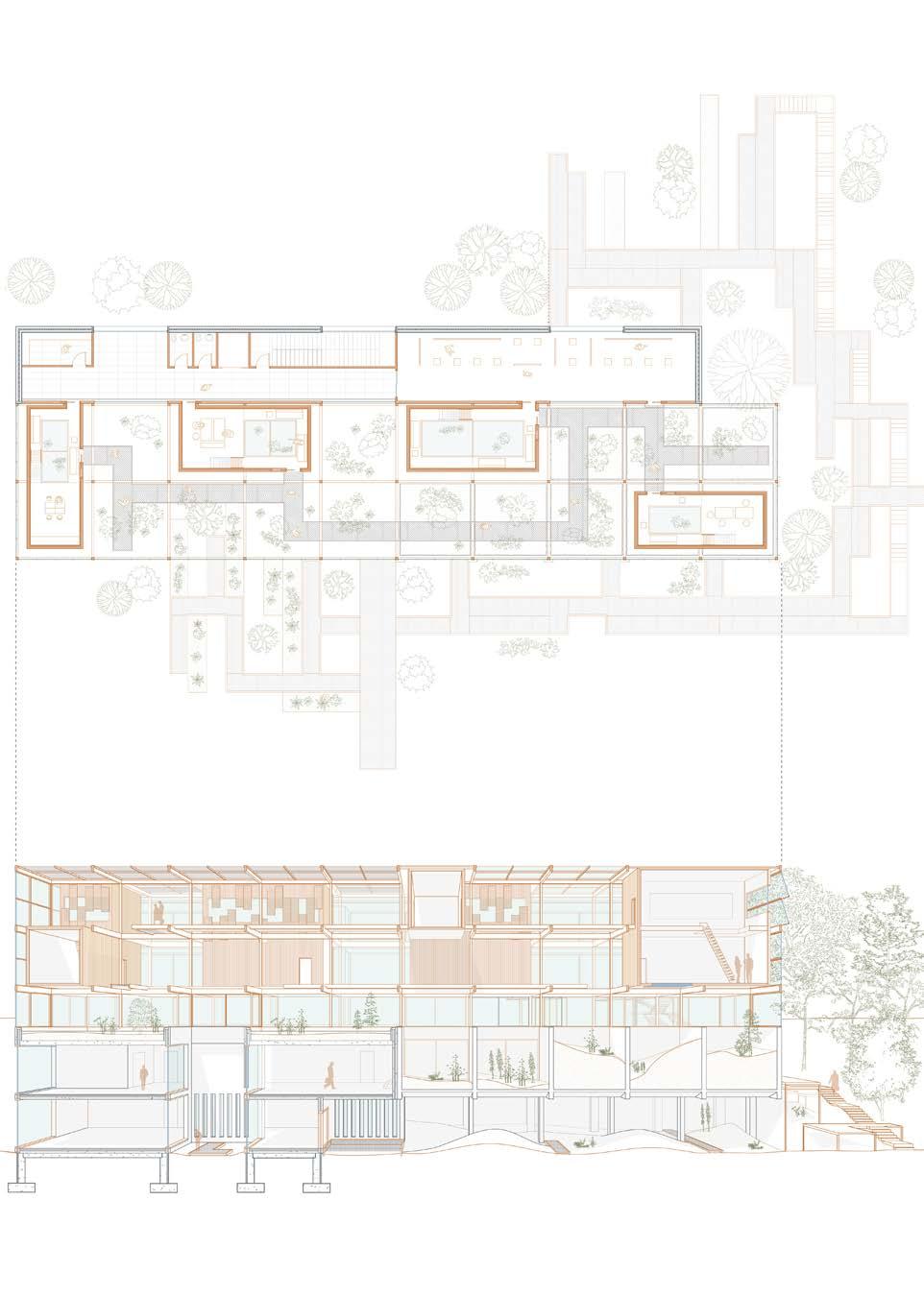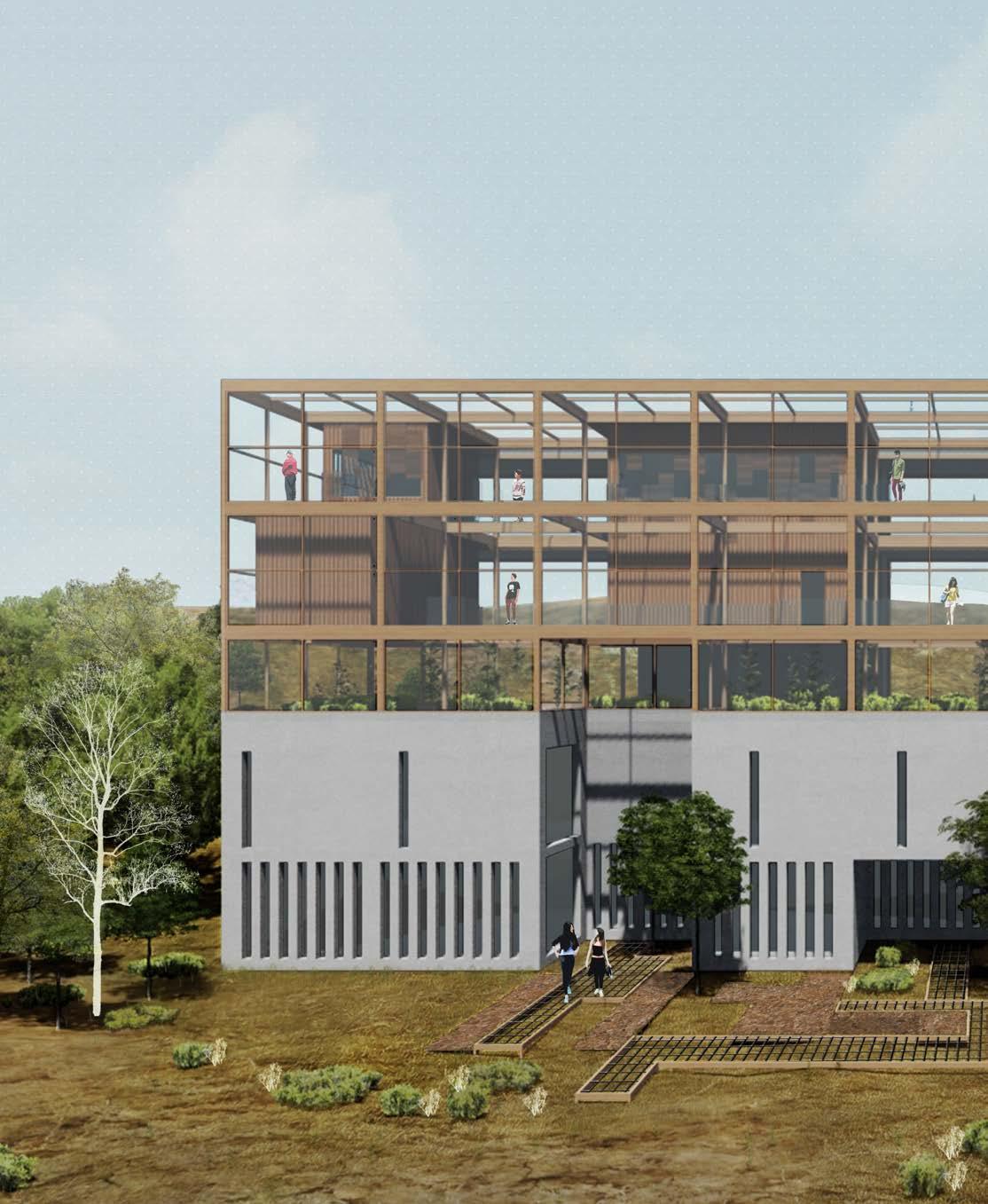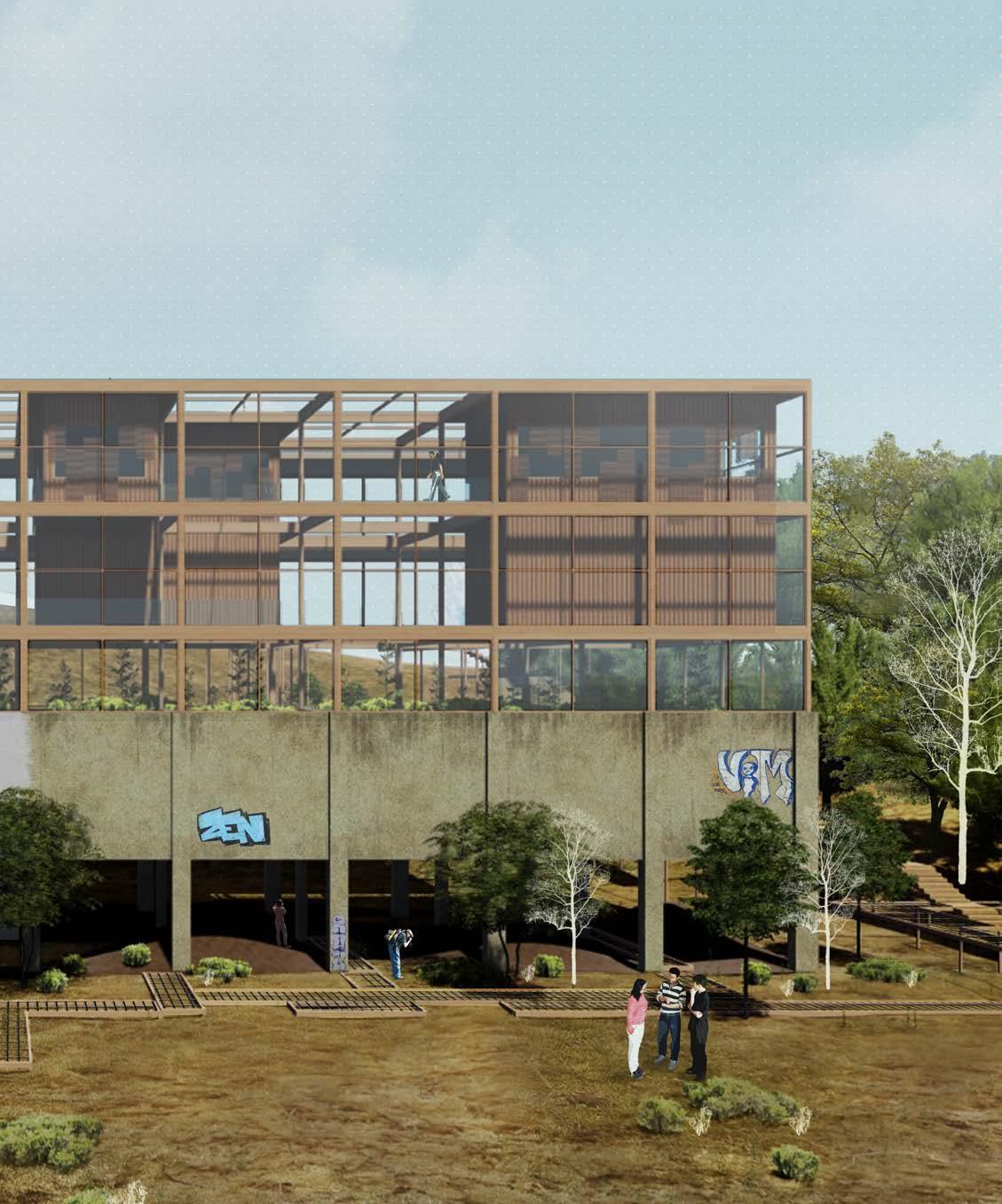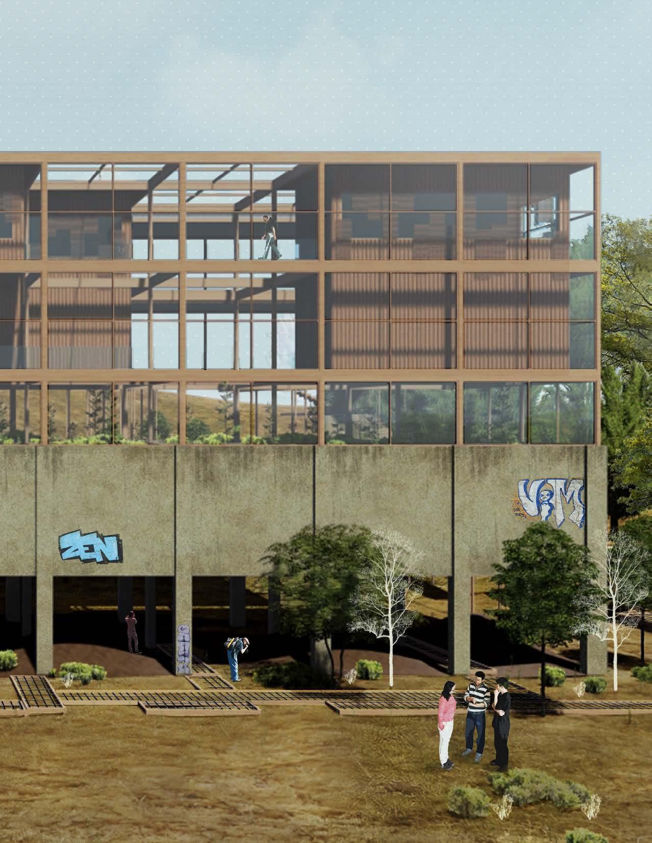 The project challenges what is considered natural by creating spaces that reframe abandoned infrastructure as part of a reframed landscape, and allow for the introduction of symbiotic interaction between humans and the new organic conditions. The site is adjacent to an abandoned loading facility at skytop quarry on South campus. The site analysis exhibits how the ruins of weathered infrastructure have led to “new wild” conditions. This “new wild” is no longer untouched, but a result of infrastructure weathering into nature for an extended period of time. This project integrates with the non-pristine nature on the site by fostering overgrowth patterns that were already occurring. The design architecturally and programmatically curates relationships between the building and the site. The top portion of the building uses light timber framing aligned with the existing grid to allow for vertical overgrowth to continue to penetrate the building. The concrete addition to the building further explores the horizontal relationship between the ground and building that exists in the original structure.