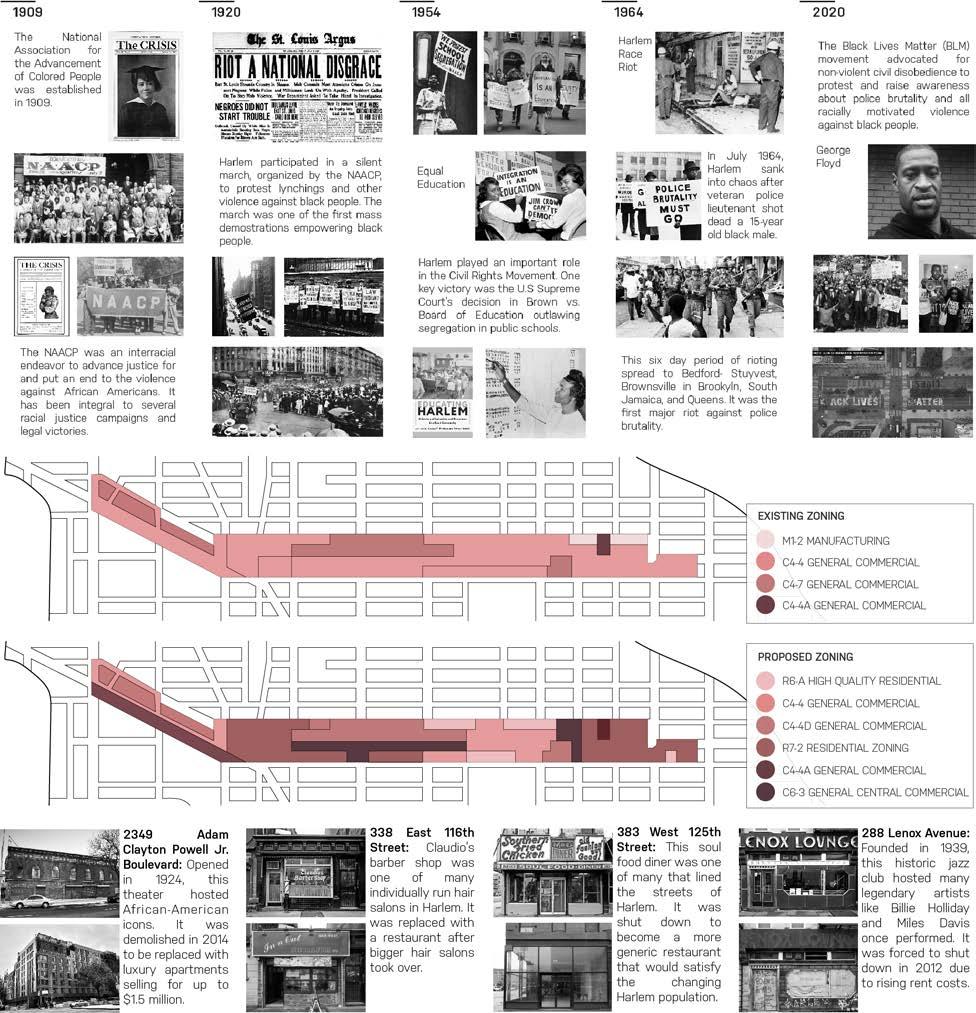 This first phase of research focused on the effect of gentrification and the history of activism in Harlem. The diagram on the right shows the contentious rezoning of 125th street. Many small businesses and manufacturers were replaced by large scale commercial and residential construction. The Harlem locals have pushed back against these top down planning attempts, which often end up forcing locals out of their community due to skyrocketing living costs.