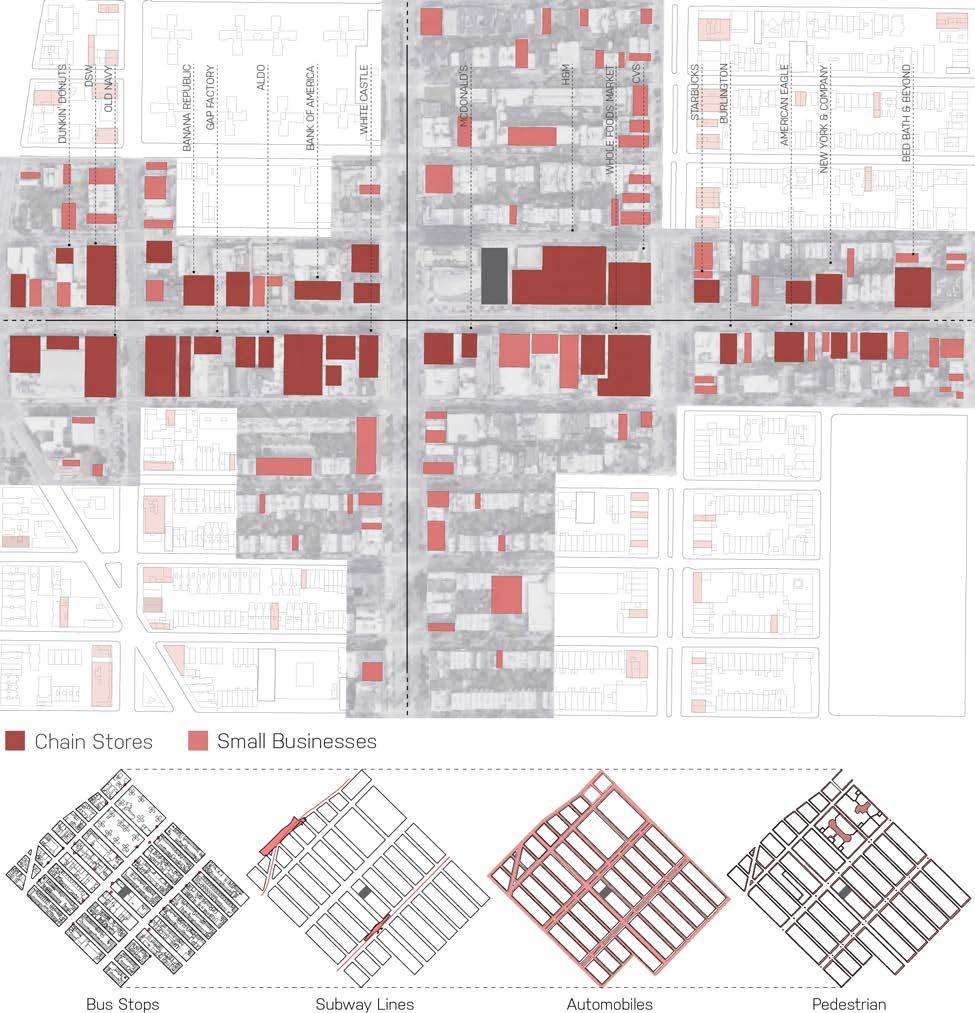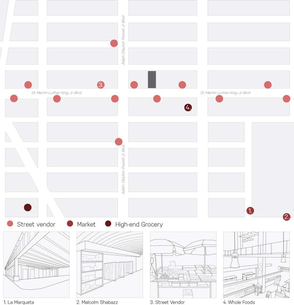 The second phase examined two main streets adjacent to our site. The analysis on the left revealed an abundance of informal street vendors on MLK Blvd who could easily be pushed out for not owning any property. Diagramming the various businesses along the site showed how many local businesses along MLK Blvd have been replaced by large chain stores. Based on these analyses, formalized vendor spaces and small business storefronts were crucial to our proposal.