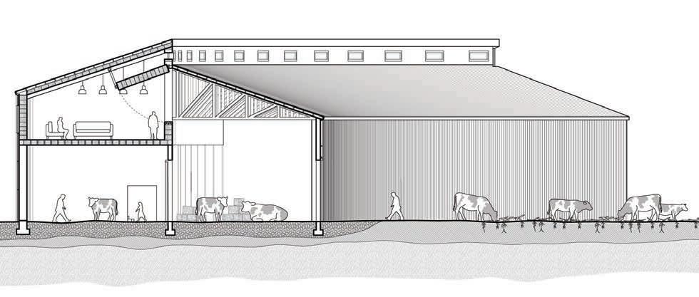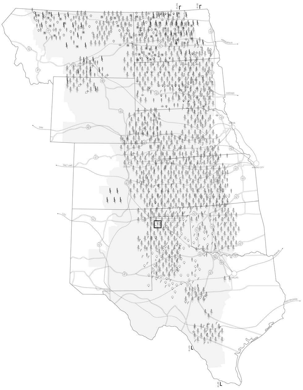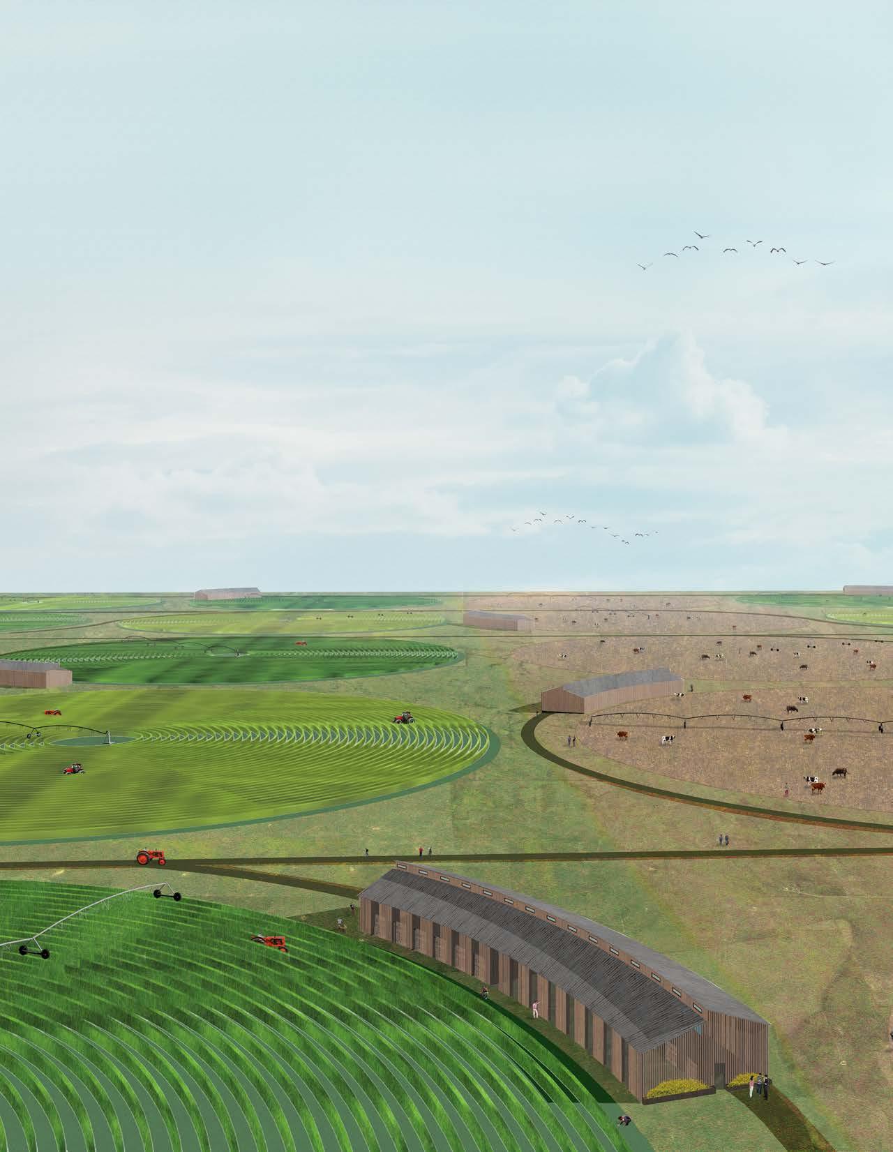 In a region plagued by environmental degradation caused by corporate farming, our project explores the future of sustainable agriculture. Our chosen 6 x 6 mile site juxtaposes a portion of the Rita Blanca National Grassland with a corporate feeding farm. Mediating between these two extremes, our proposal is a largescale integrated crop and livestock system (ICLS). This method manages both crop and livestock production so they support each other. Since this system has never been implemented at a large scale, the sheds also act as research facilities. The scattered agricultural sheds are designed to accommodate the seasonally changing animal grazing, crop growth, and research programs. The building includes residential spaces, research laboratories, as well as a double-height adaptable barn, which can house humans, cows, or large machinery. The insulation and ventilation systems change throughout the project depending on the occupants. This creates various thicknesses of enclosure ranging from the mesh-like screen to the thick hay insulated dormitory walls.