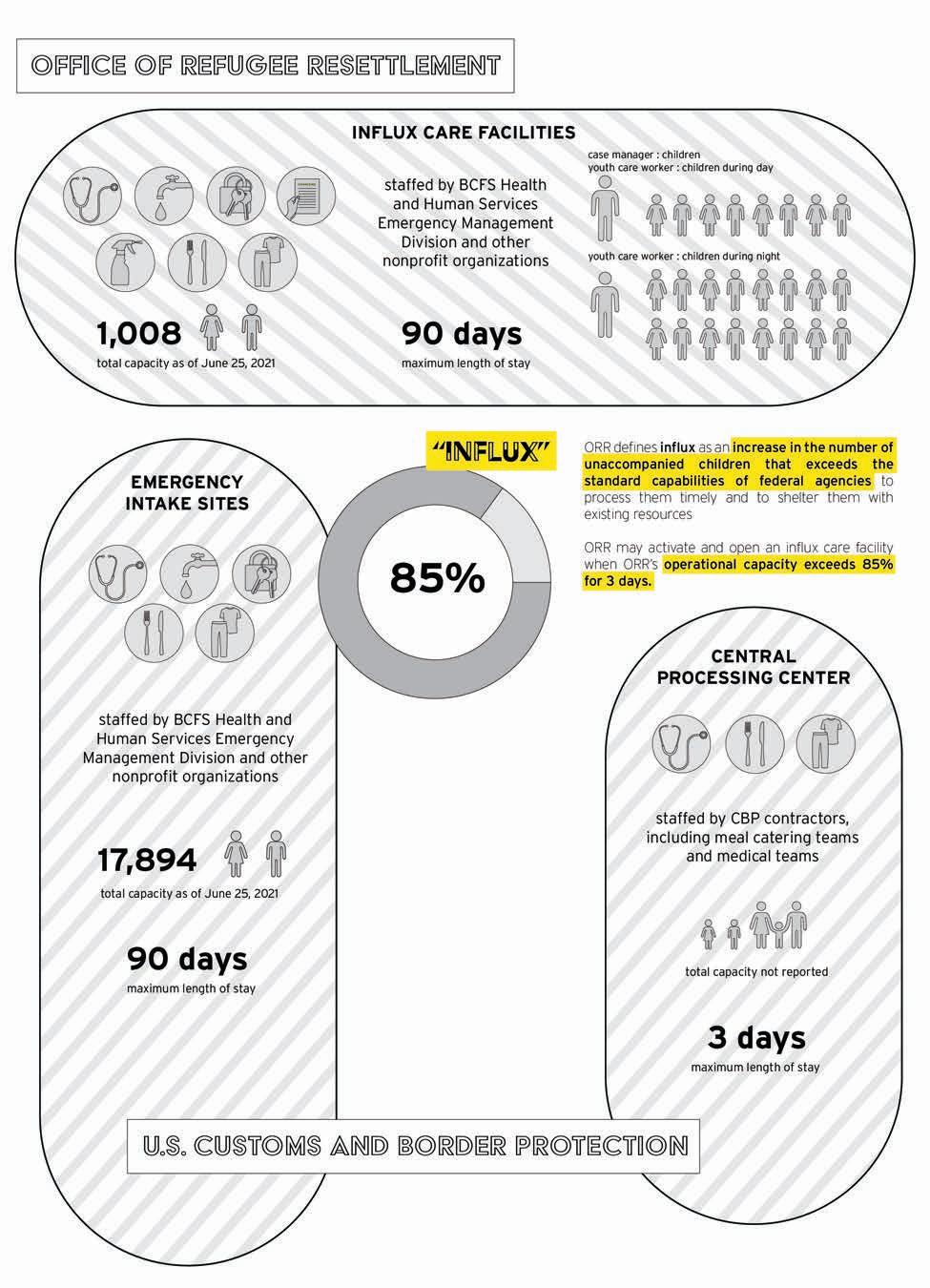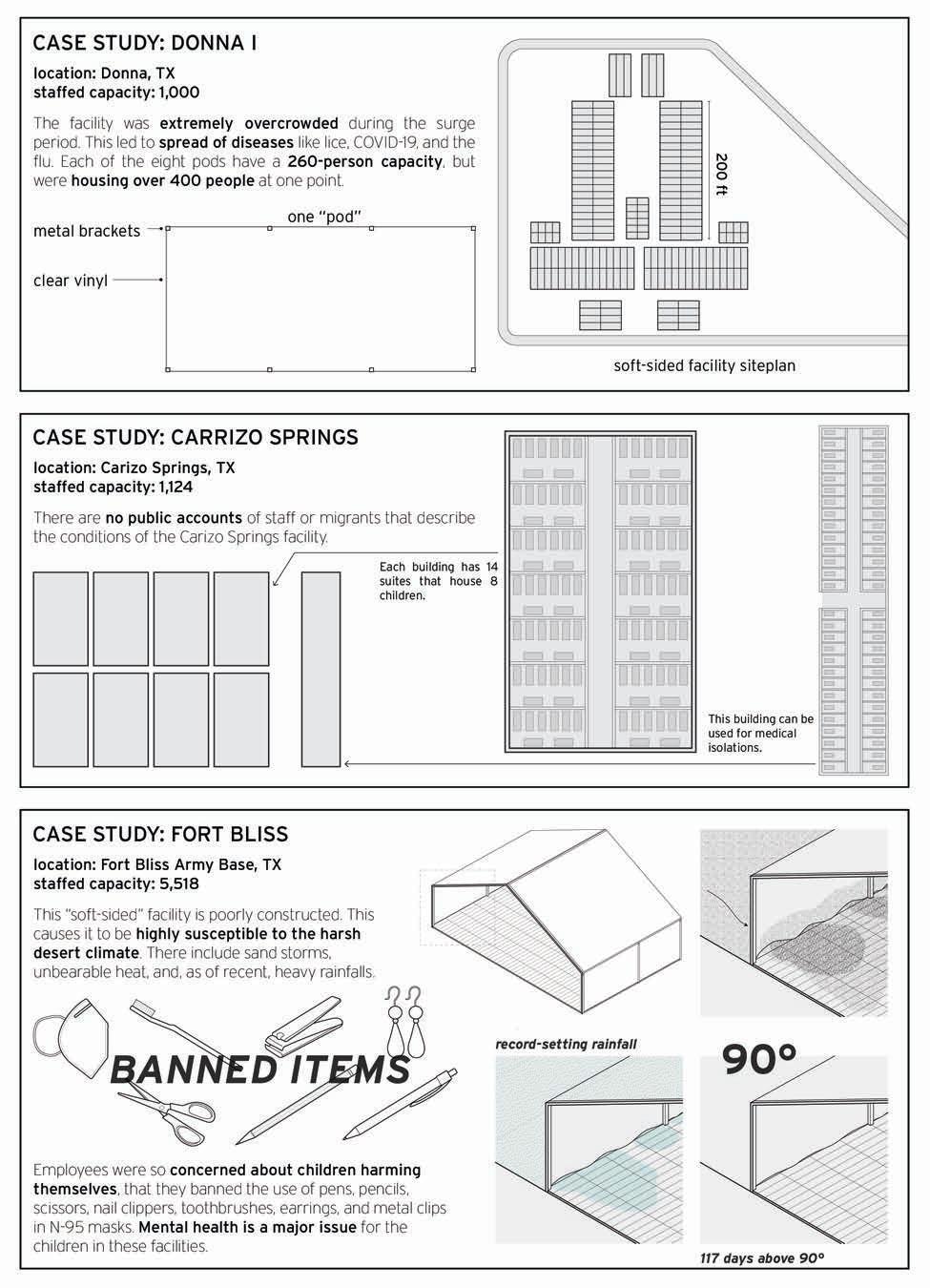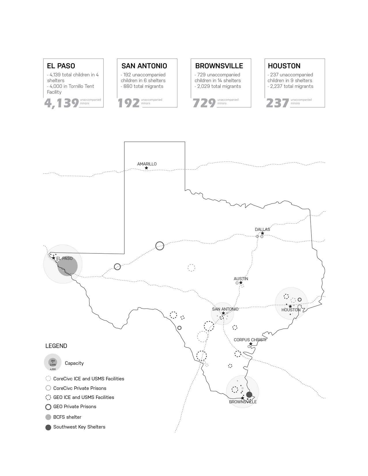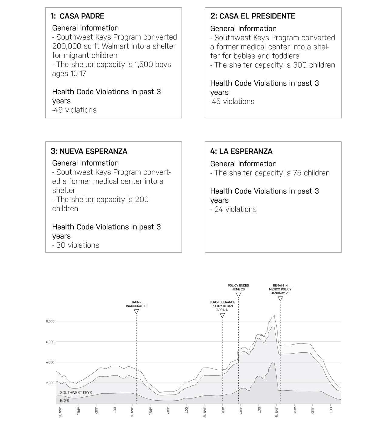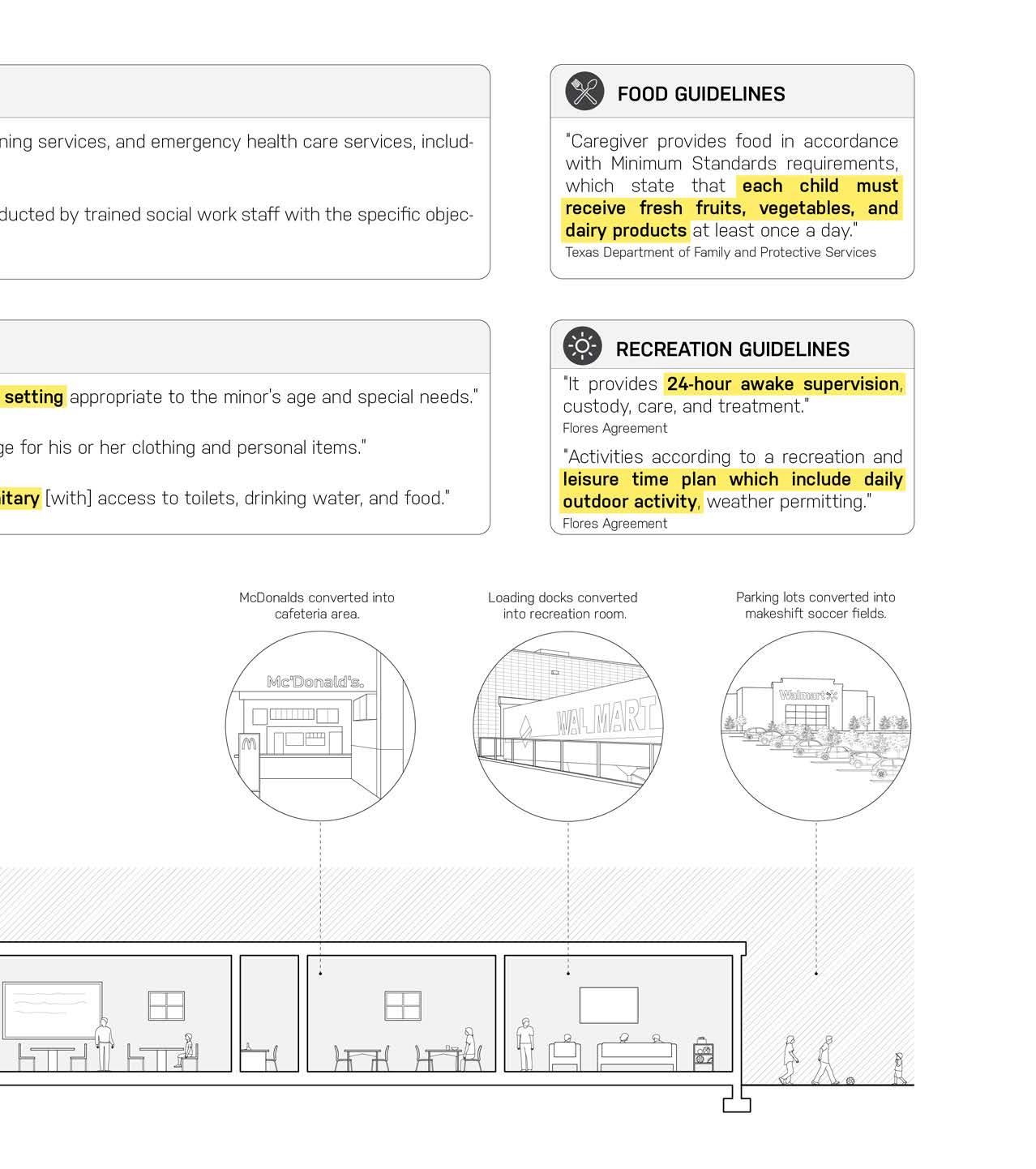 This ongoing research aims to use code violations, shelter renovations, and policies to analyze the quality of care unaccompanied migrants receive in Texas shelters. The first phase of this project consisted of a literature review to understand the constantly changing immigration policies that affect the process of seeking asylum for migrants crossing the southern border of the United States. The increased amount of unaccompanied minor crossings has led to private nonprofit companies developing a multi-million dollar industry to provide shelter for these migrants. The state of Texas has the highest concentration of shelters, which makes it a crucial case study. Southern cities, such as Brownsville, have a significant amount of unaccompanied minor shelters owned by nonprofits such as Southwest Keys and BCFS. In addition to the urban scale investigation, I examined individual shelters. The Casa Padre shelter houses thousands of minors, and is run by Southwest Keys in a converted Walmart. The presumptive section of the shelter illustrates the requirements outlined by the Flores Agreement and Texas State Health Codes.