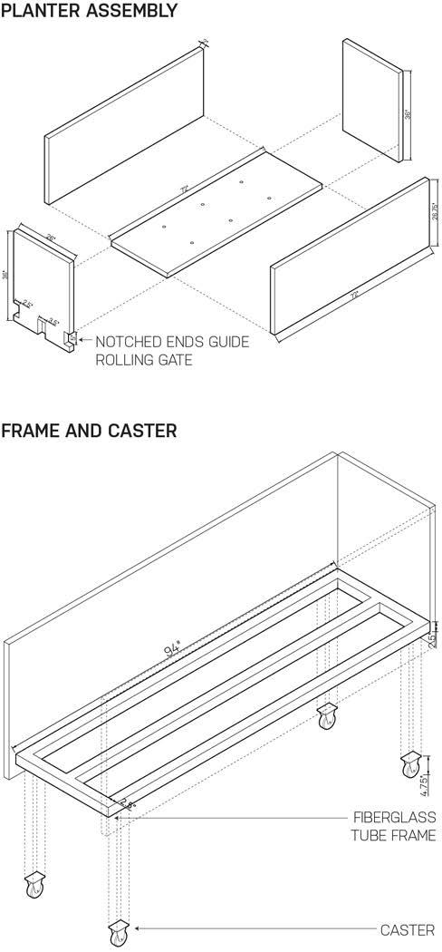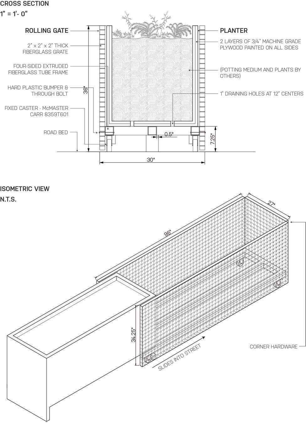 The Loisaida Open Streets Community Coalition aims to reclaim Avenue B as a public space for local residents free of dangerous automobile traffic. Over the summer, this organization programmed the avenue with various workout classes, workshops, and other events. However, the existing street barriers were constantly being moved out of place and were not effectively blocking traffic. The Design Advocates team came up with a three part solution to address this issue. The first element is a rubber speed cushion to create a physical and visual reminder for cars to slow down, which would not obstruct emergency vehicles. The second part is a planter barrier with an attached fiberglass rolling gate. These would be fixed on the street and the gates could be rolled out for various events. Finally, the parklets use a similar planter structure and assembly, but would be easily movable. These could provide seating for workshops and concerts or serve as waiting areas for open restaurants. The Design Advocates team presented the proposal to the Department of Transportation to be tested on three intersections along Avenue B.