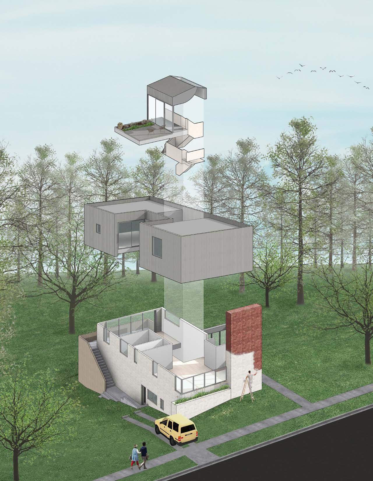 This project by MKCA expands on the existing brick structure of a house in Washington D.C. The diagram and model represent the overall design strategies and materiality. The diagram emphasizes the central circulation core which connects the bottom floor with the roof terrace and skylight. The modelling technique highlights the contrast between the sharp, polished aluminum panelling and the lime washed brick. The project is currently under construction.
