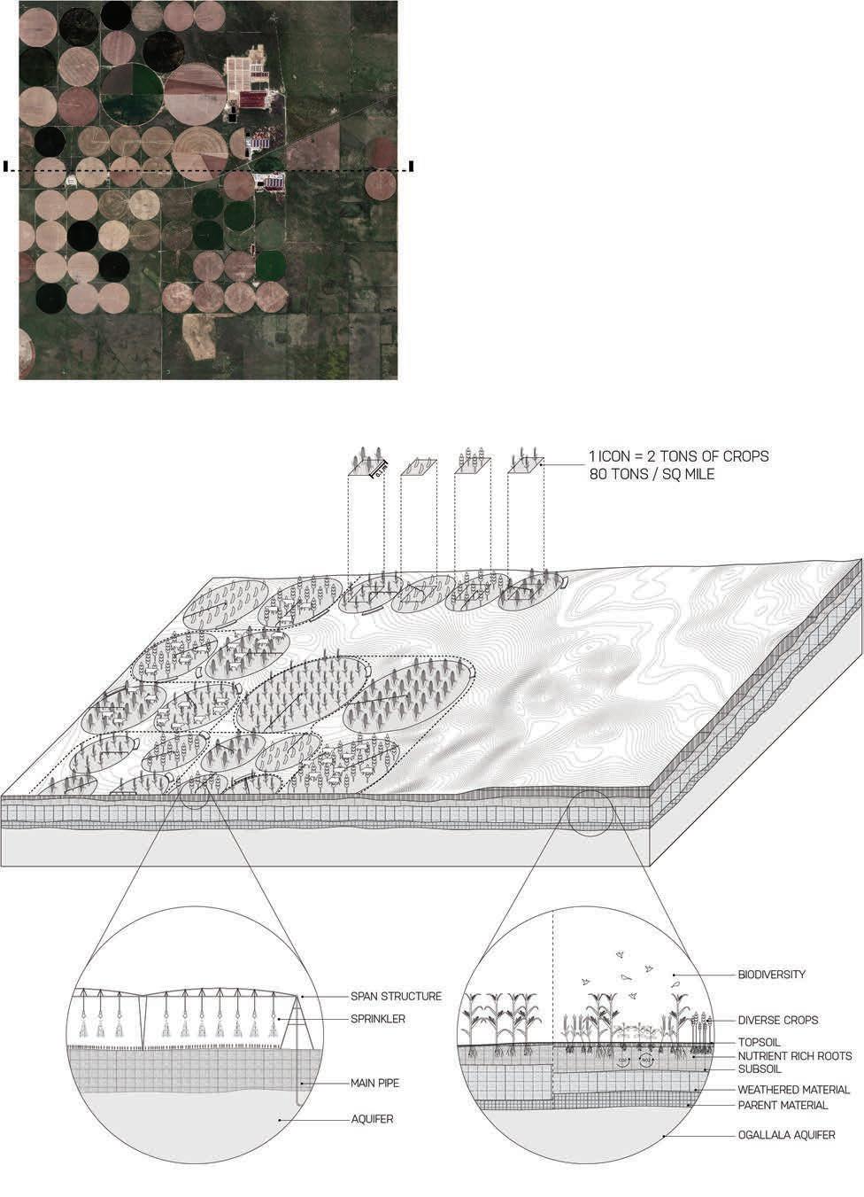 The map on the left illustrates the massive crop outputs and infrastructures of corporate farming that have taken over the Great Plains. The aerial image shows our site in the northeast of Texas, and the dichotomy between the feeding farm and the grassland. The site section below shows how the scattered research facilities are situated along the pivot farms. The detail drawings explain how central pivot irrigation works and how the eroded soil conditions from unsustainable farming practices can be rehabilitated after ICLS farming is implemented.