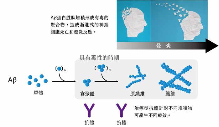 A β 蛋白胜肽是一種無結構的短鏈胜肽,主要由 40 ∼ 42 個胺基酸組成。在堆積的過程中會聚集形成有毒的多 倍體聚合物──寡聚體( oligomer ),成為原型纖維 ( protofibrils ),進而形成長直鏈的不可水溶的成熟纖 維( mature fibrils ),長期下來便沉積在腦中形成老年 斑塊(圖一)。