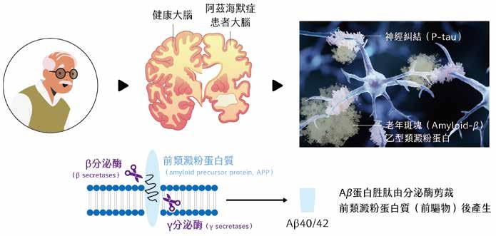 阿茲海默症的病理特徵為腦部出現錯誤摺疊的蛋白質堆 積。患者大腦中有兩種主要的蛋白質堆積,其中一種