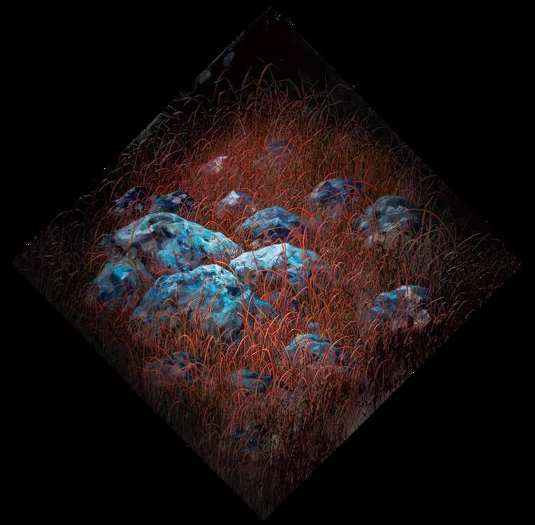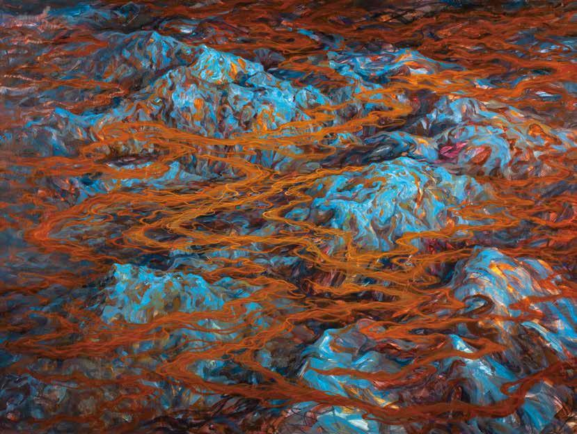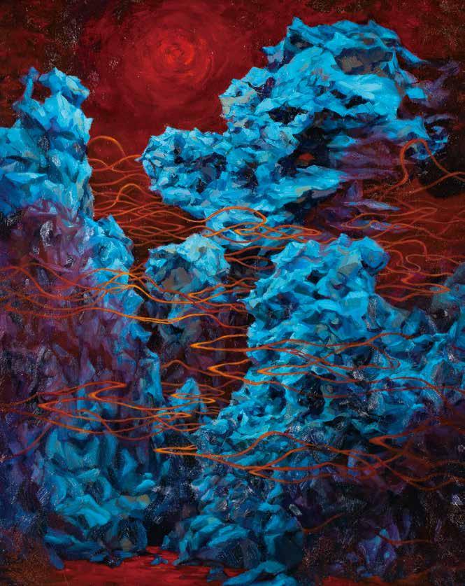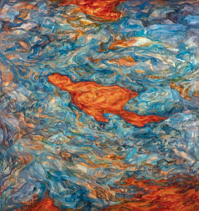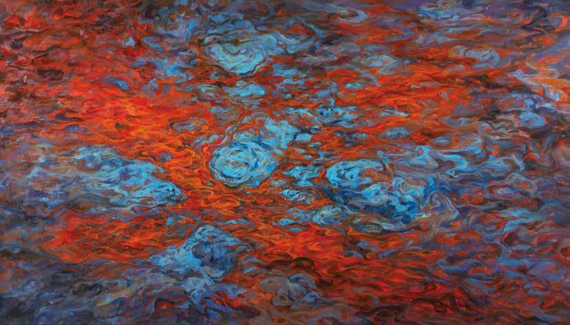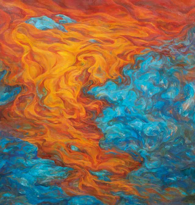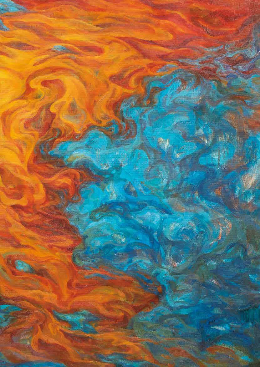 開始建構自身、形成大山的高敏感族群,雖然已找尋到屬於自身的共同族群、 不像小石子般的孤獨,但未能肯定自己的思緒仍持續游移在自身腦海間。因 此將代表高敏感族群之山脈,以柔性的筆觸與堅韌的刮刀並置使用,呈現在 此階段的他們,雖仍有對抗外在的堅硬外殼,但已開始試著看見自身的敏感 所能促成的柔軟。曾經束縛住他們的水紋,也逐漸化為煙霧的型態,已然不 像先前令人窒息不已的水流,有時還是會遮蔽高敏感族群,讓他們看不清自 己所真實擁有的樣貌。
