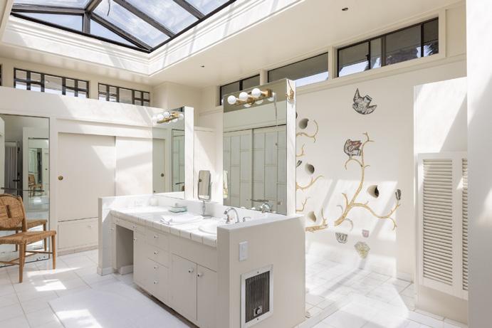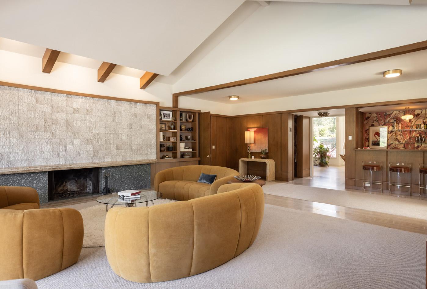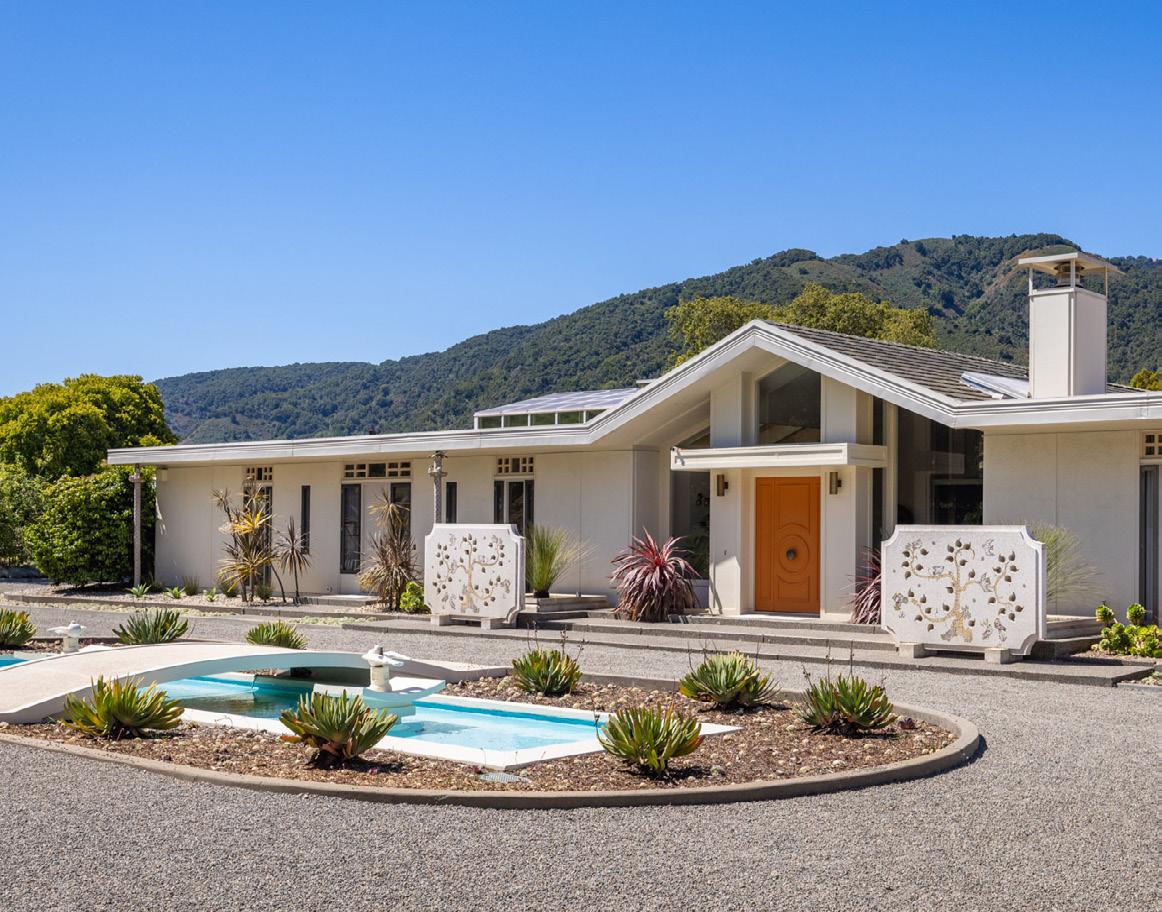 From the point of entry, it’s clear that Sunlit Hills is an extraordinary property. The porte-cochere style entry courtyard includes a lit bridge fountain, and the front door is flanked by sculptural freestanding mosaic murals made by famed California mid-twentieth-century mosaic artist Millard Sheets. His mosaics are scattered throughout the house, and all evoke the Carmel-by-the-Sea art scene of the 1960s.