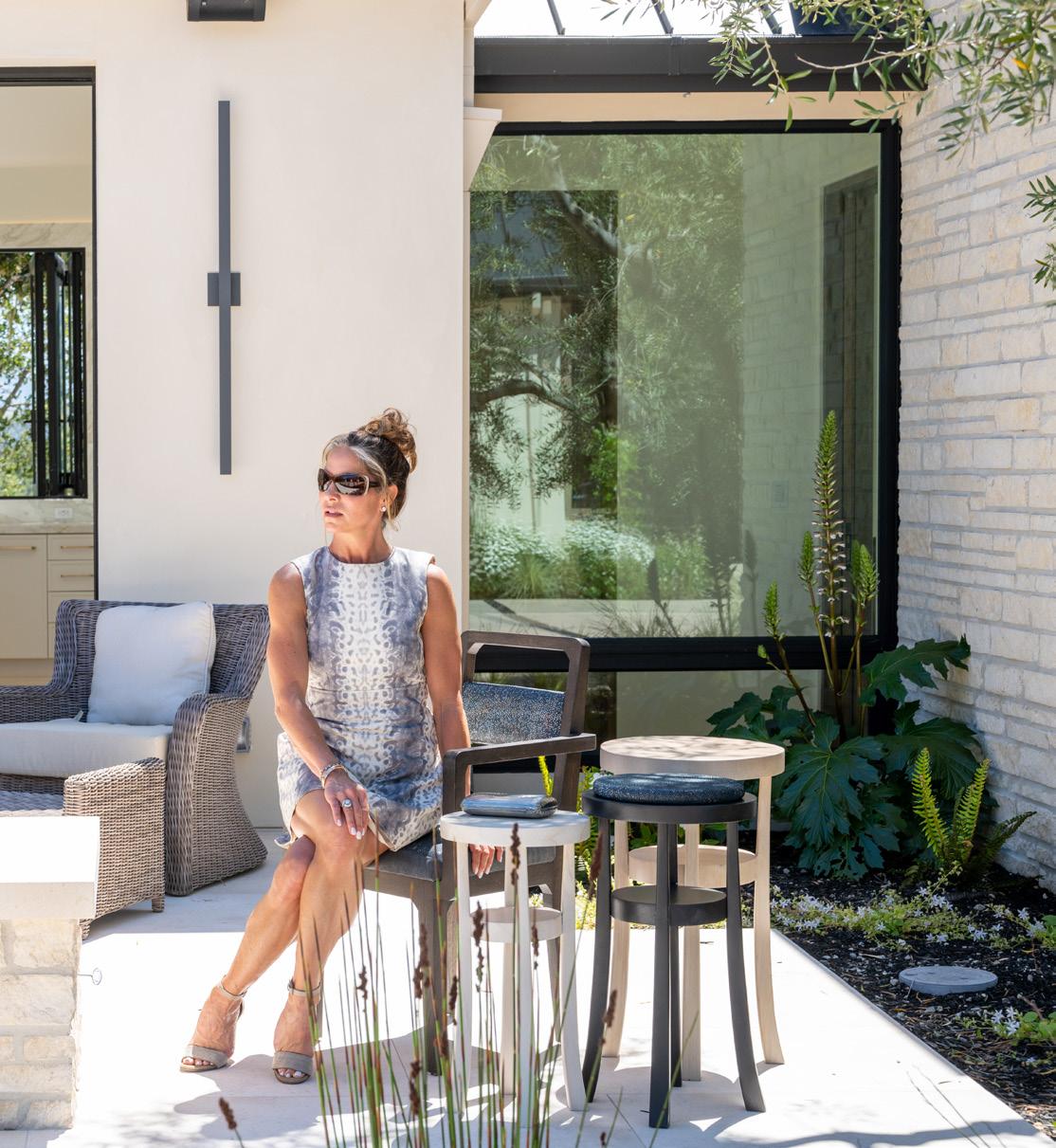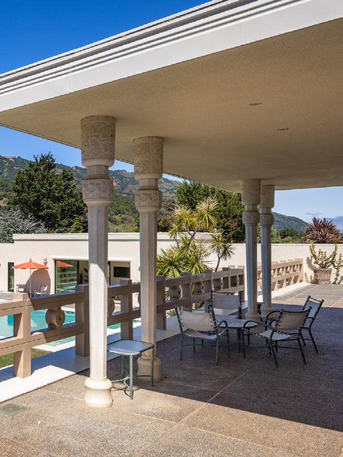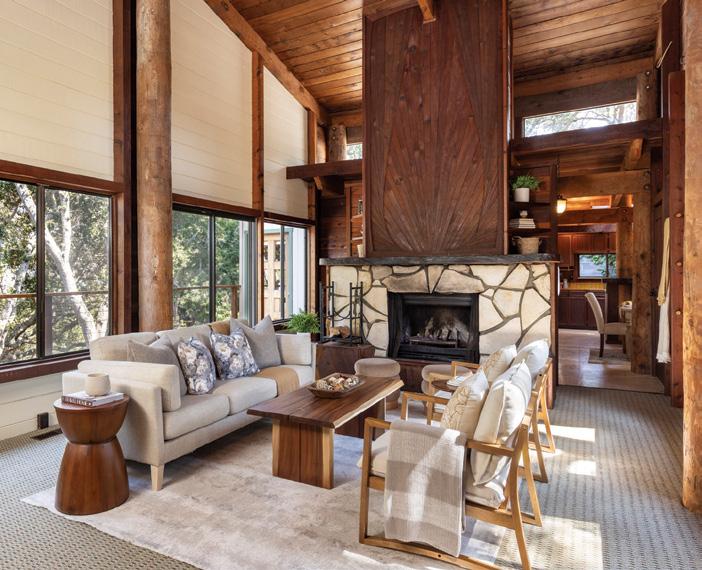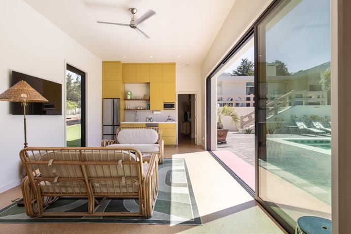 At the main house, the back porch’s runway layout overlooks a pictureperfect Slim Aarons-style poolscape with unspoiled, dramatic views of the Santa Lucia Mountains behind and the property’s open meadow below. A private patio lines the full length of the home—there’s a firepit seating area snuggled against a potted cactus garden and a breezeblock.