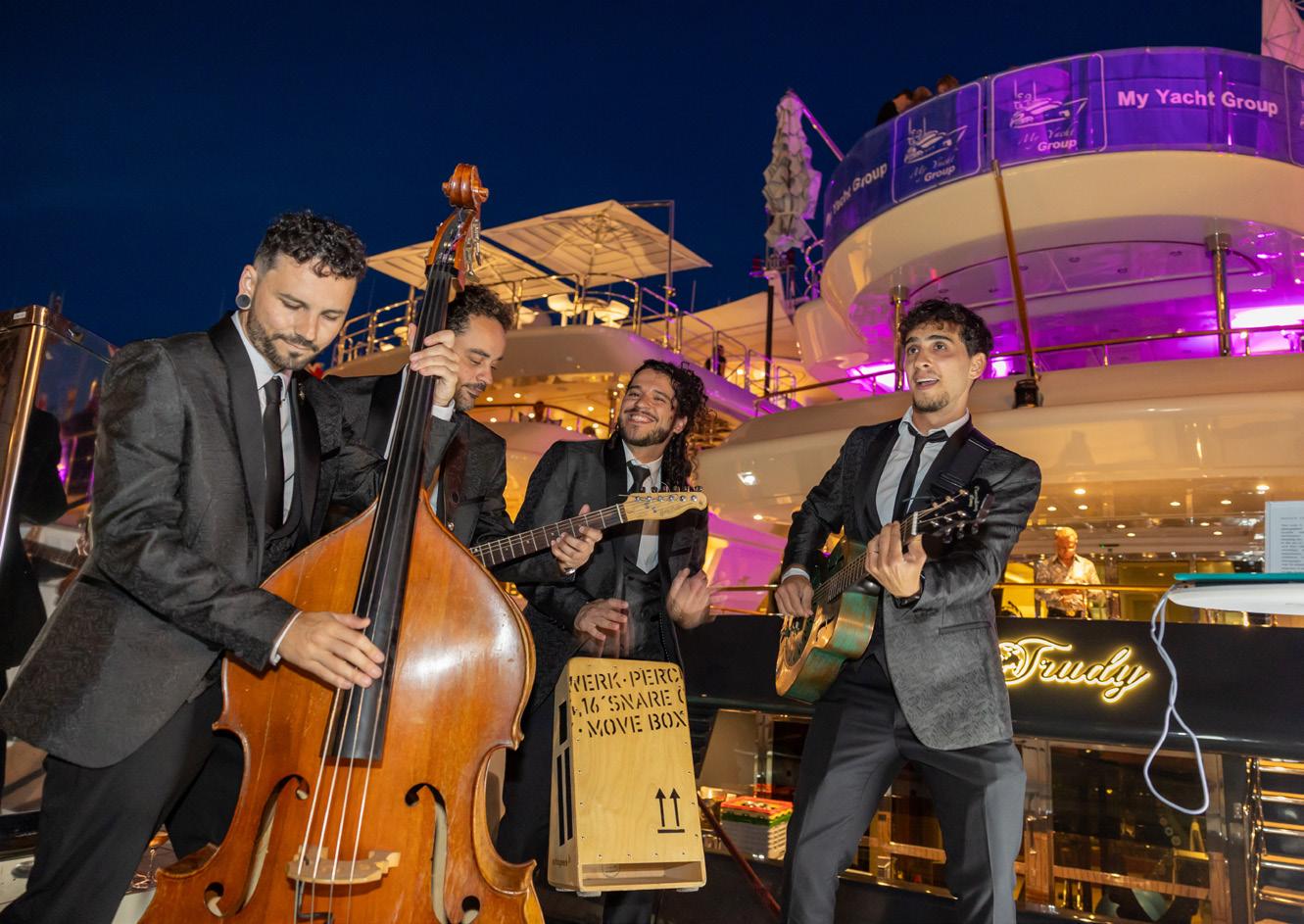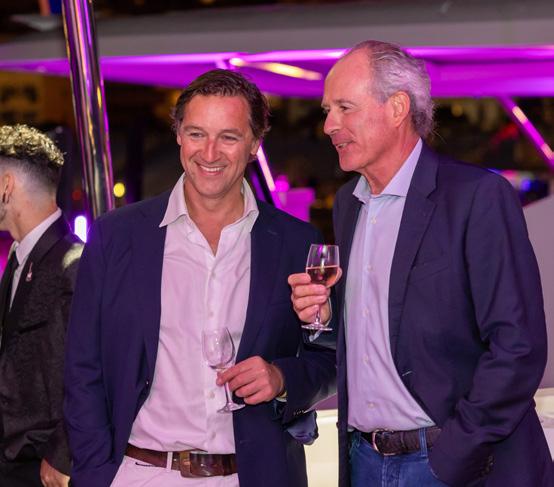 Ensuring a convivial atmosphere, large-format bottles of Château d’Esclans’ Whispering Angel and Rock Angel, magnums of 100% Champagne Regi Grand Cru, plus vintage Camus cognac flowed throughout, accompanying exquisite catering by Monaco’s own Monte-Carlo Société des Bains de Mers, and ameliorated by Numero Uno caviar served on mother-of-pearl spoons. Guest favorite The Odd Sox International, the Côte d’Azur’s number one strolling band, kept the tunes—and energy—going late into the night. Saturday evening saw guests welcomed to a private villa reception that showcased new state-of-the-art residential superyacht Ulyssia (featured in 65°/57°’s last issue), which is set to become the most exclusive residential community at sea. And, in grand Monaco tradition, Sunday evening ended at world renowned Jimmy’z Monte-Carlo, with DJ Black Coffee and race winner Leclerc celebrating at the next table.