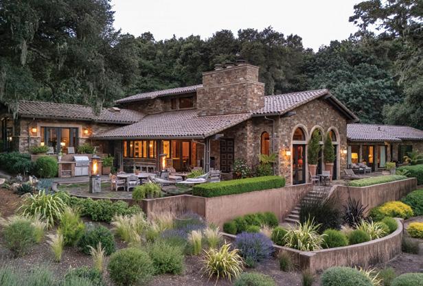 Strolling through Carmel Realty Company’s Sunlit Hills is a delight for the senses because of its small hobby vineyard, tiered stone rose garden, olive groves, and organic kitchen garden. That’s in addition to four acres of terraced gardens with formal and informal outdoor eating areas and a bocce court.