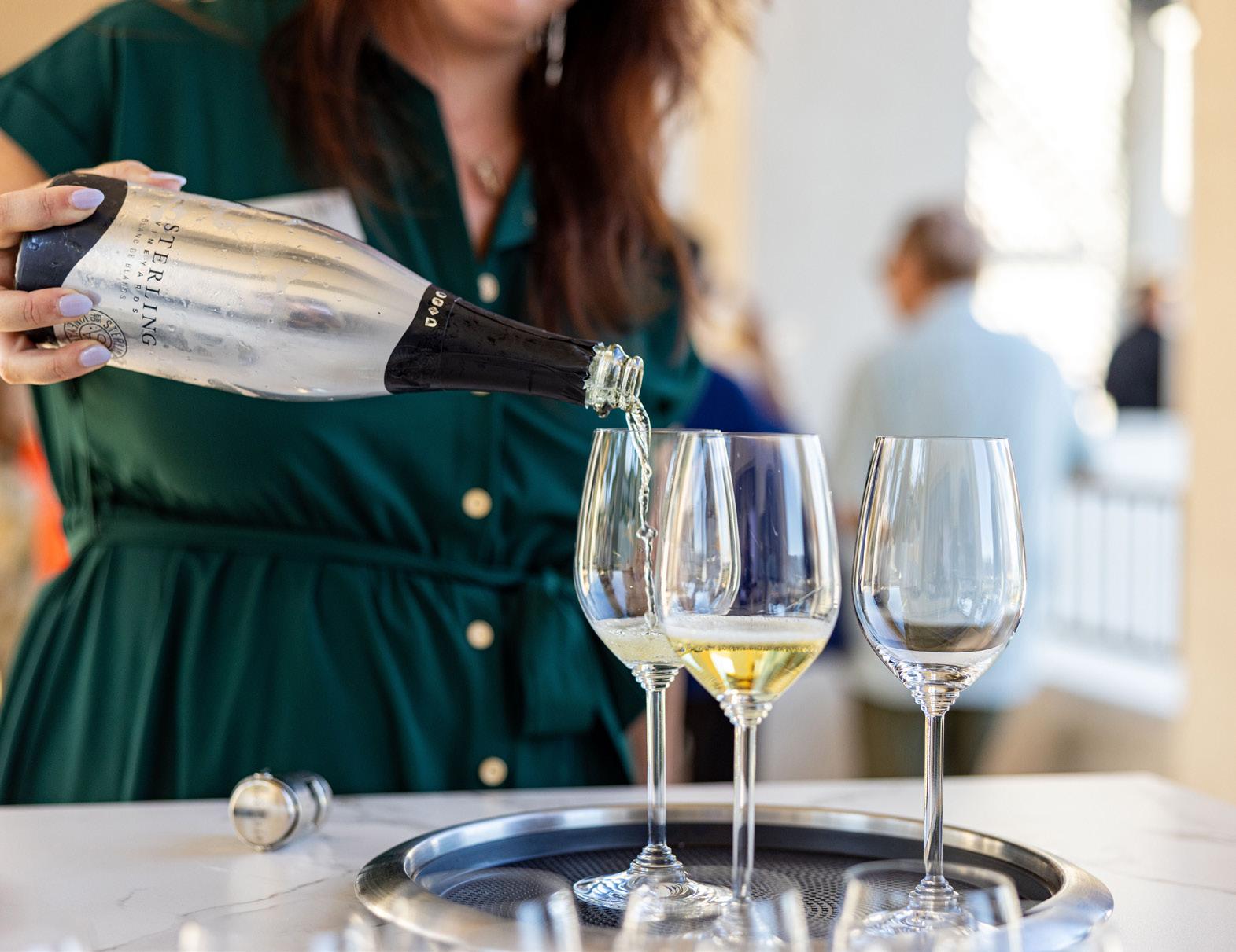 On a recent summer evening, wine enthusiasts gathered to celebrate six decades of winemaking, history, and service. Transformed into a jazzy supper club for the evening, Sterling’s Hilltop Tasting Room and Terraces hummed with excitement for the next chapter in the winery’s story while exploring its historic past. Guests enjoyed an interactive dinner experience, a nod to Sterling’s food and wine program that was first established in 1989. With Napa Valley views at every turn, guests were served dishes crafted by the in-house culinary team and paired with a selection of current release wines, wine from the Platinum series, and gems from the cellar, including the 2005 Three Palms Merlot, 1996 Diamond Mountain Cabernet Sauvignon, and 1980 and 1973 cabernet sauvignons. Guests were also invited to sit for a “vignette du vin,” a personalized portrait painted using Sterling red wine—a unique souvenir from the soiree.