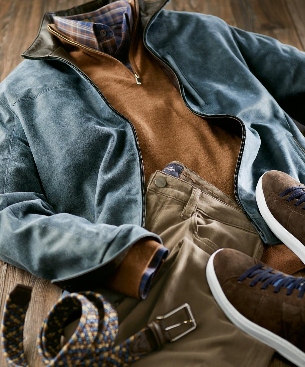 What his store, Patrick James, landed on for fall 2024 are supple leathers, suedes, corduroy, cashmere, and extra fine merino. This season’s colors are greens, earth tones, and wine shades in addition to the ever-present blues. Mon Pere Jr. recommends complementing the palette with bold pops of color, such as red, purple, and orange.