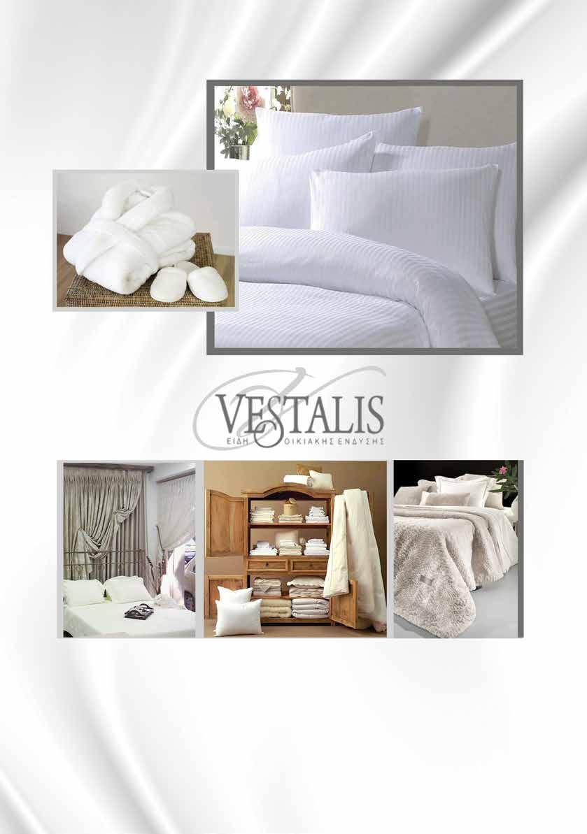 ΝΕΑ συλλογή από ΟΡΓΑΝΙΚΑ υλικά VESTALIS Μάρκου Μπότσαρη 21, Τ.Κ. 54643 Θεσσαλονίκη 231 085 8568 www.vestalis.gr info@vestalis.gr ΞΕΝΟΔΟΧΕΙΑΚΟΣ –ΟΙΚΙΑΚΟΣ ΙΜΑΤΙΣΜΟΣ Η εταιρεία Vestalis δραστηριοποιείται στο χώρο του εμπορίου λευκών ειδών, τροφοδοτώντας ξενοδοχεία, ενοικιαζό μενα δωμάτια και εστιατόρια σε όλη την Ελλάδα. Με πρωταρχικό στόχο την ικανοποίηση των πελατών μας, επιλέγουμε με βάση την ποιότητα και την μόδα, σε ότι αφορά το