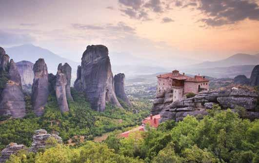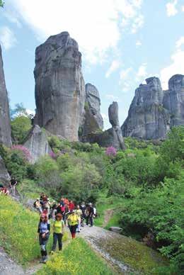 θέα των πανύψηλων σκουρό χρωμων βράχων προκαλεί δέος. Φωλιασμένα στις κορυ φές και στις σπηλιές τους από τον 11ο αιώνα, τα μοναστήρια. Με σχοινιά, με δίχτυα ή με τα γυμνά τους χέρια οι μοναχοί καθιέρωσαν μια πα ράδοση αιώνων: αναρρίχηση. Σήμερα αναρριχητές από όλον τον κόσμο έρ χονται στα Μετέωρα, για να αναμε τρηθούν και αυτοί με τους θεόρατους βράχους. Η UNESCO έχει χαρακτη ρίσει τα Μετέωρα ως «Διατηρητέο και Προστατευόμενο Μνημείο της Ανθρωπότητας». Το ελληνικό κρά τος ως «τόπο ιερό, αναλλοίωτο και απαραβίαστο». Προσθέστε και εσείς το δικό σας χαρακτηρισμό στο «βι βλίο επισκεπτών» των Μετεώρων, που φτάνουν τα 2 εκατομμύρια κάθε χρόνο.