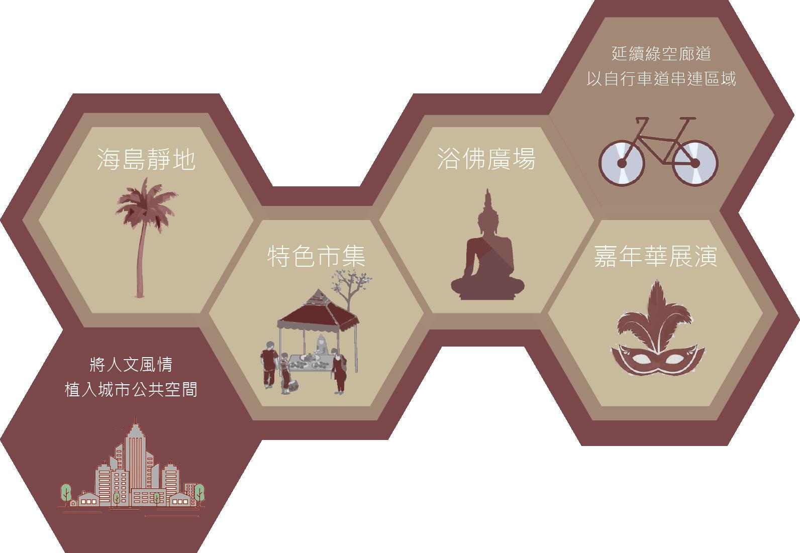 泰國意向的延伸,與自行車道穿梭在浴佛廣場兩側,增 添空間的趣味性