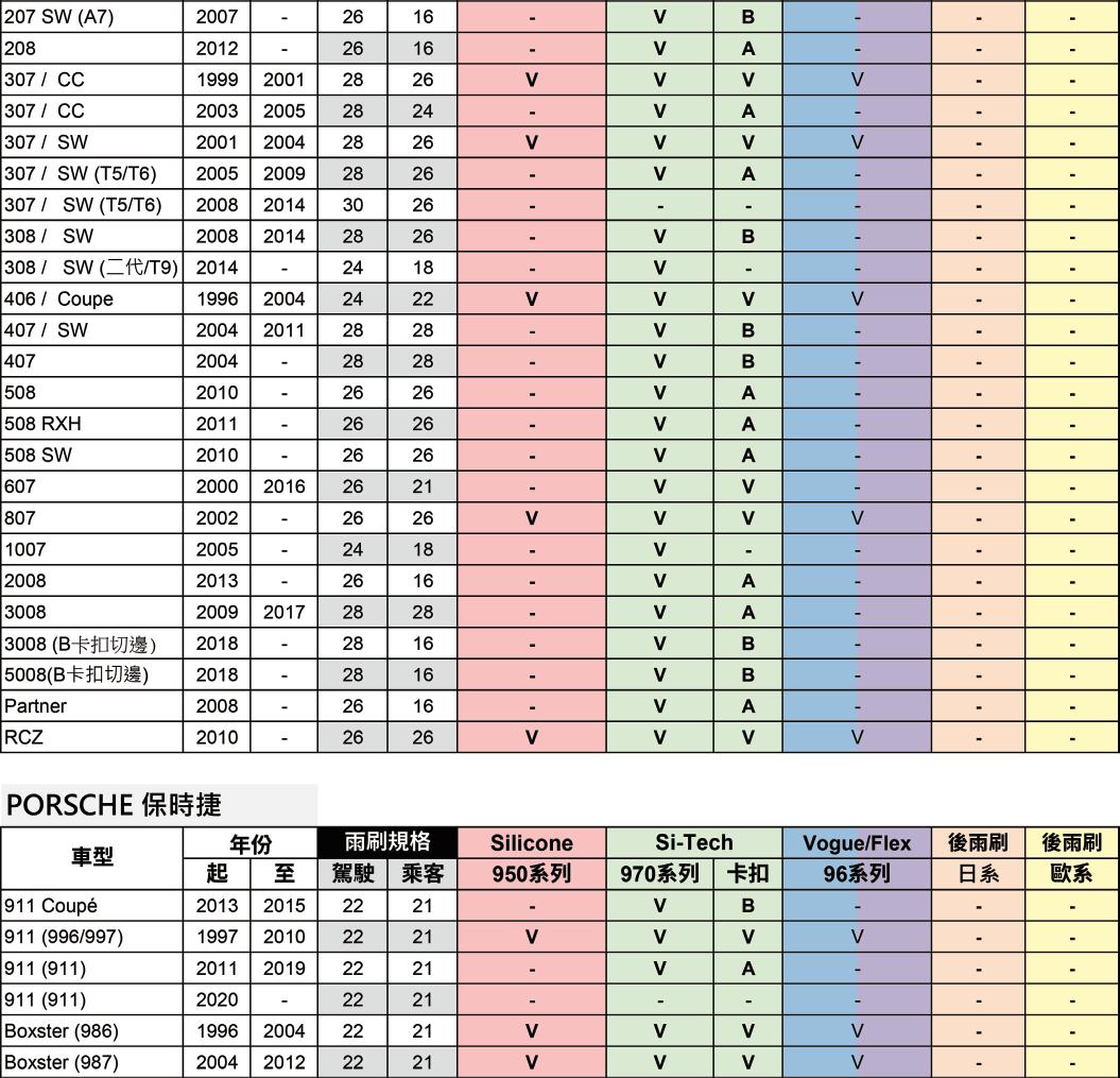 ※後雨刷為一般U型鉤之車款,適用紅色包裝950鐵骨雨刷