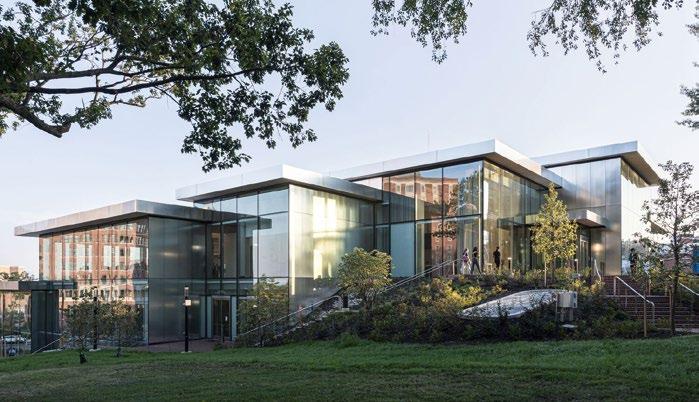 утворюючи цілісне середовище для спілкування, навчання й відпочинку. Навколо центральних сходів, що об’єднують усі чотири рівні, розташовано лаунжі, зали для подій, простори для ігор, мистецтва та відновлення. Атріум із зеленими кашпо став «вітальнею» кампусу — місцем зустрічей, відпочинку й натхнення. Натуральні матеріали — білий дуб, вапняк, клеєна деревина — додають інтер’єру теплоти, а продумана акустика створює затишок навіть у великих відкритих просторах. Територія довкола, спроєктована MVVA, охоплює тераси, зони для заходів, зелені подвір’я й місця відпочинку просто неба. Команда MVVA відома своїми масштабними урбаністичними проєктами, зокрема Бруклін-Брідж-Парком,