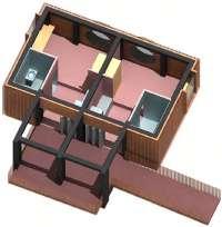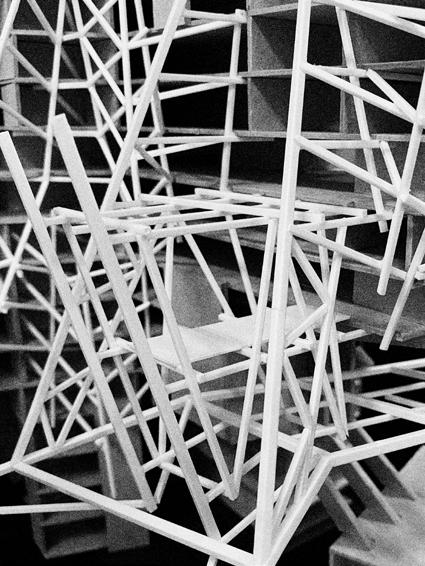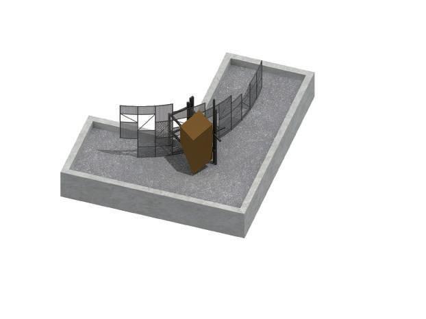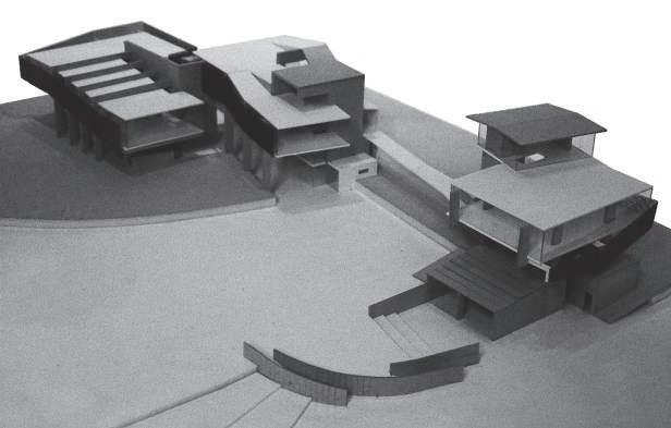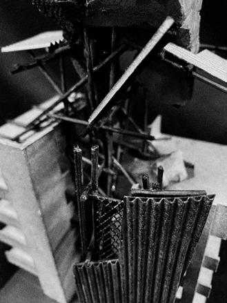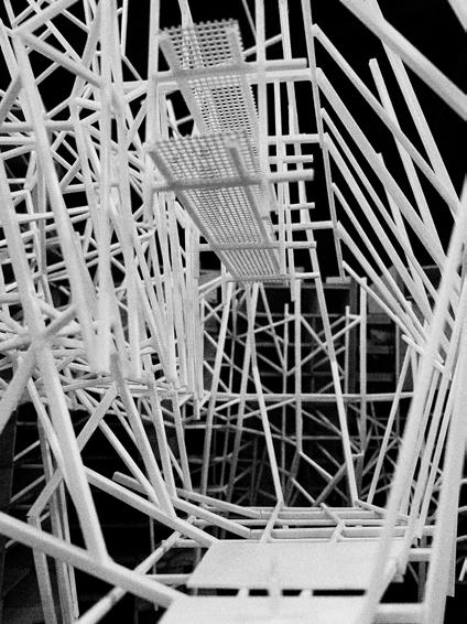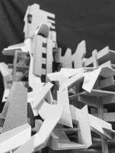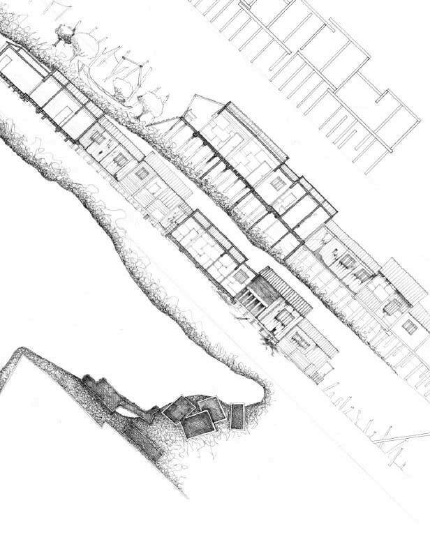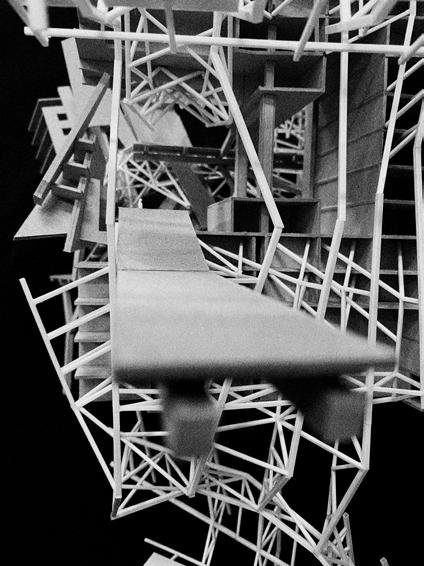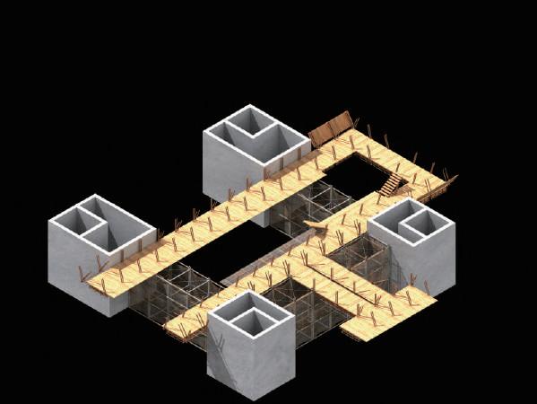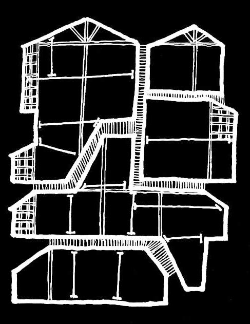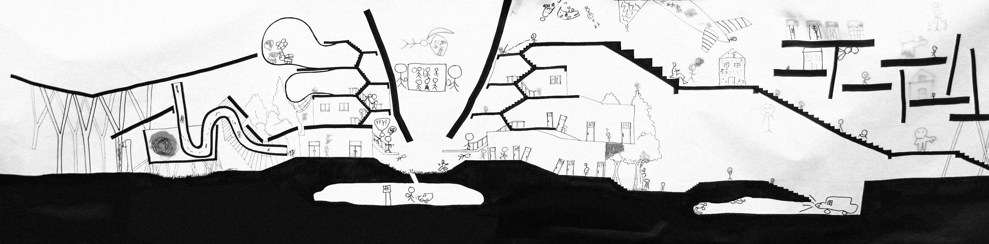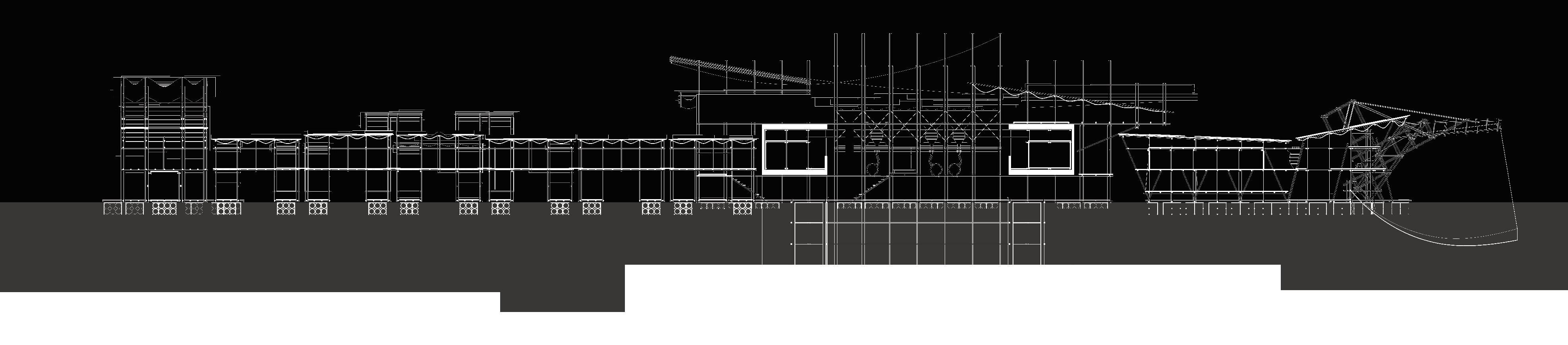 A bridge points towards the river wall, symbolizing people's longing for the outside world. From the bridge, one can overlook the giant metal pieces conceptualized from the wreckage. They outline a dramatic space distinct from the main volume: an outdoor stage and three-generational homes. The stage provides a center for this disoriented area, while the three-generational homes reintroduce the interpersonal relationships of the old society into this increasingly alienated area.