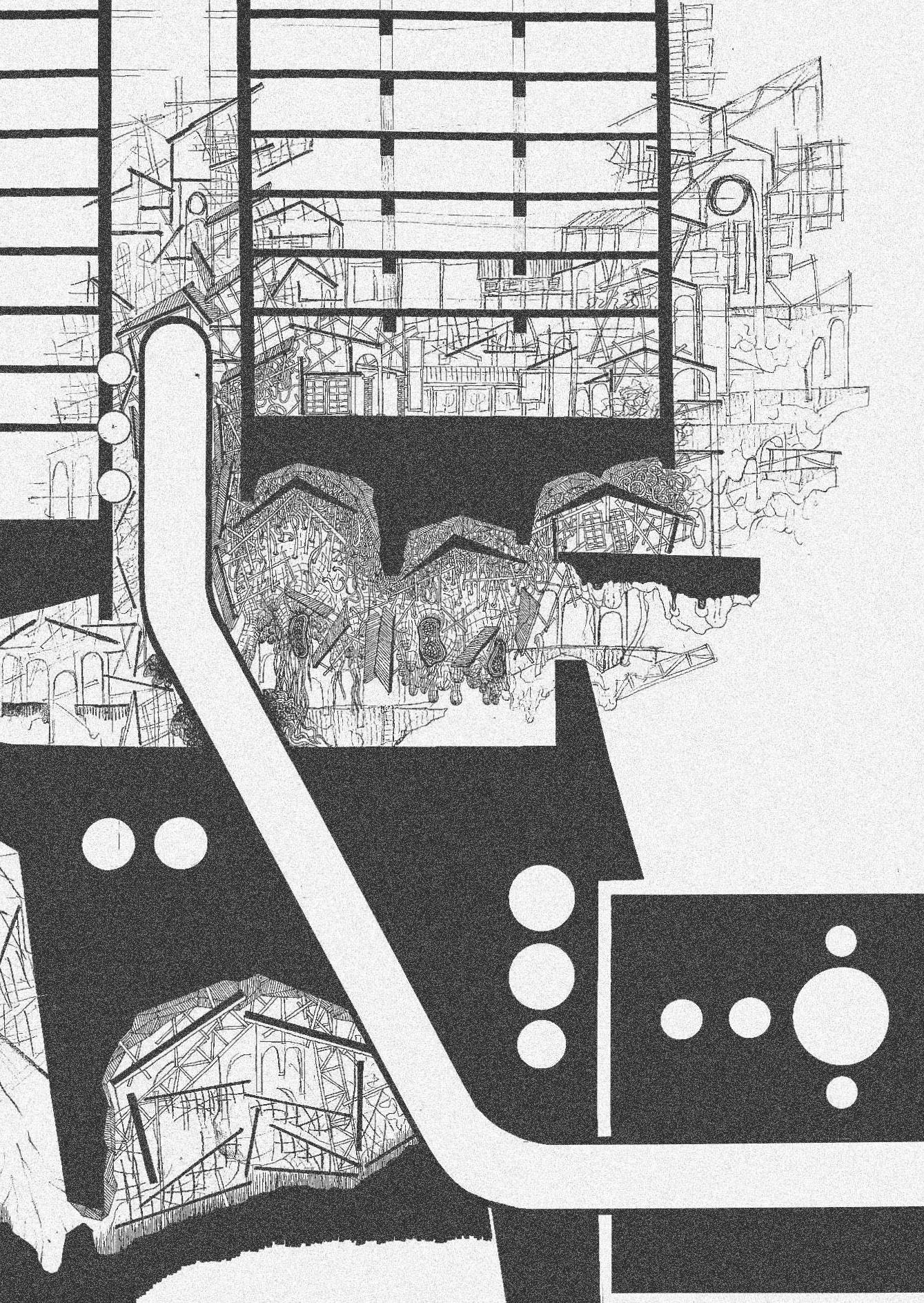 In reality, people from the industrial zones and old towns have already secretly infiltrated the superstructure. They abandon armed conflict to avoid repeating history, aiming to radically transform the area through spatial means. They fill the gaps in the superstructure with their newly developed spatial system. The process of building together also re-establishes social connections, bridging the class divide.