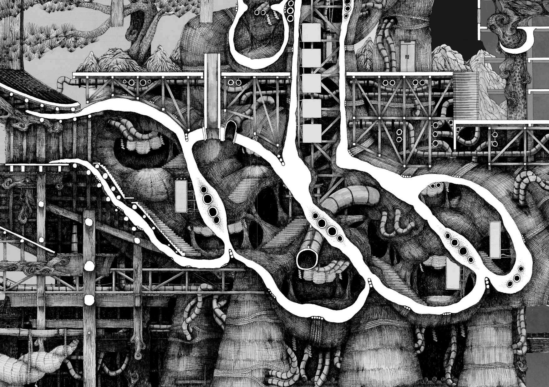 There's a rudimentary water-based settlement at the estuary of the Tamsui River. I wish to construct a water-based repair platform for them to fix boats, aiming to draw more attention to this area. Through drawing, I record their complex expansion patterns, using this as a basis to develop my design framework.