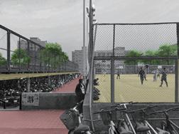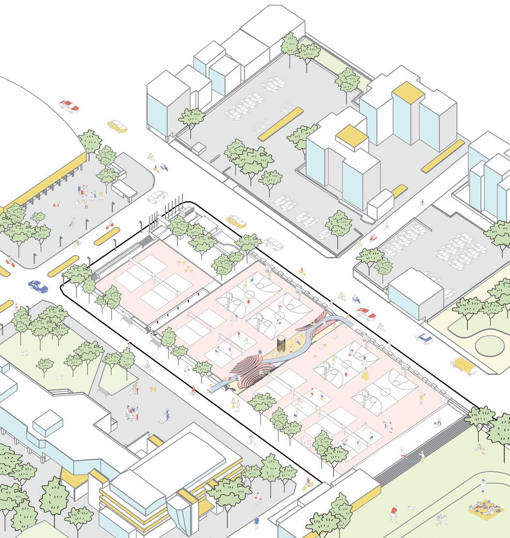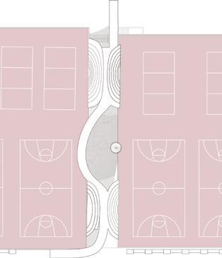 People sitting on the terrace can see what’s going on from both courts. Moreover, the gradually rising terrace is able to block the balls from falling out. 將球場周圍的「樹」移入縫隙之間,利用似樹一般由下往上發散的鋼構枝條建立觀眾席與步道的骨架,骨架間再置入網子或是更細緻的鋼條,模擬陽光 透過樹葉間空隙撒在樹蔭的地面上所形成的亮點。 we take the element of trees from the surrounding, placing it in the gap, using steel