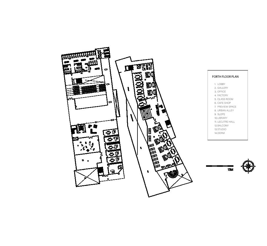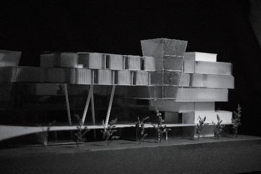 Besides, The building can differentiate into three blocks, with the west side consisting of offices and a lecture hall and the east side consisting of a hotel and shops. The three will interact differently during use. For example, the hotel's fitness center and kitchen will also serve the co-working space, and the thirdfloor library space will be open to the public. In addition, I have also built a sky bridge between the community center and this project, which will stimulate discussions and interactions among different users.