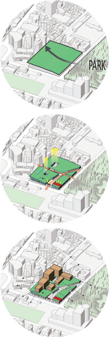 While meeting future commercial intensity and inclusivity, we differentiate the open spaces of social housing. Using vertical integration, we blend urban life with social housing, allowing everyone to share this area and Tainan Park. We redesign the connection between the train station and Tainan Park with an outdoor pedestrian street along Fu Bei Street, maintaining commercial vibrancy and ensuring social housing entrances. Gradual green rooftops offer better views and extend walkability, while the Fulong Temple archway marks the northern commercial entrance.
