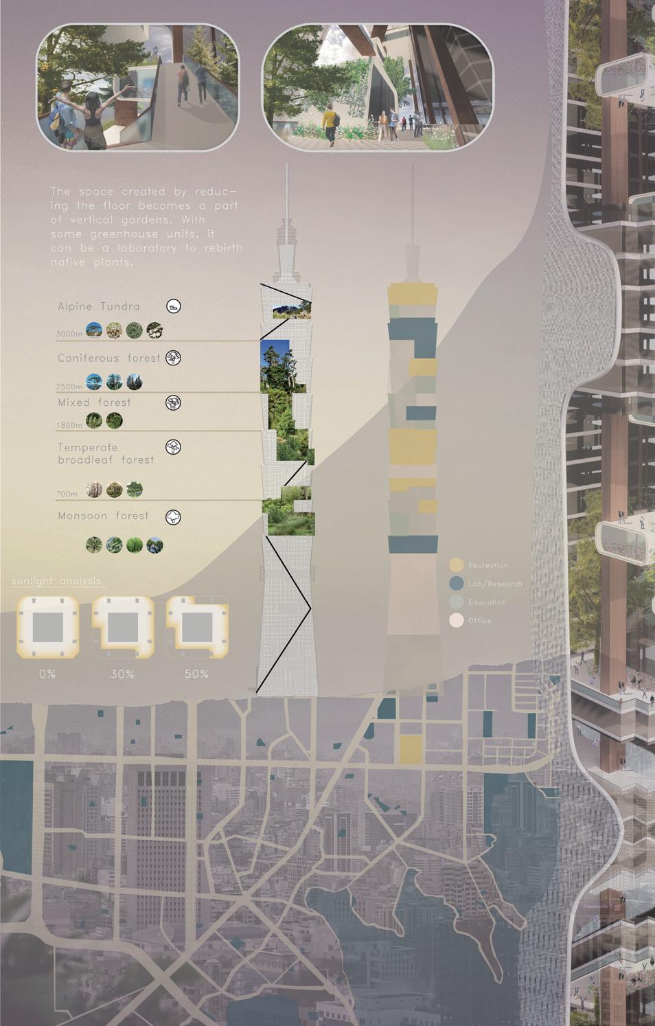 By repurposing unoccupied office spaces into a lab promoting native plants and opening up the building to visitors, Taipei 101 becomes a true public building. Removing some floors ensures sufficient sunlight in the center area for plant growth and provides multiple viewing points from reserved interior space. We also organize exhibition areas that simulate the building's verticality and create vertical gardens using the reduced floor area, with a greenhouse lab to promote native plant rebirth. This transformation will create an interactive and educational experience for visitors while promoting sustainability in the concrete jungle of Taipei.