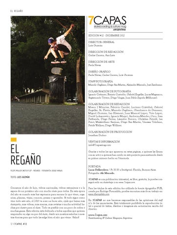 Cerramos el año de lujo, videos nacionales, videos extranjeros y a la espera de un próximo año con mucho skate para todos. En ésta época del año es cuando más hay esperanza para encarar lo que viene, organizar, planear, viajar, conocer, pensar y aprender. Si todo sigue como vino todo este año, el 2013 va a ser un buen año, ojalá que hayan más skateparks, más videos, más marcas, más revistas y mucha actividad hechas por skaters para el skate. Todo es posible con un poco de orden y muchas ganas. Ésta edición está dedicada a todos aquellos que quieren emprender en algo en pro del skate, desde acá nuestros saludos y nuestras fuerzas para que todo les salga bien el año que viene. !Salud! 12 \ 7 C A P A S # 1 2